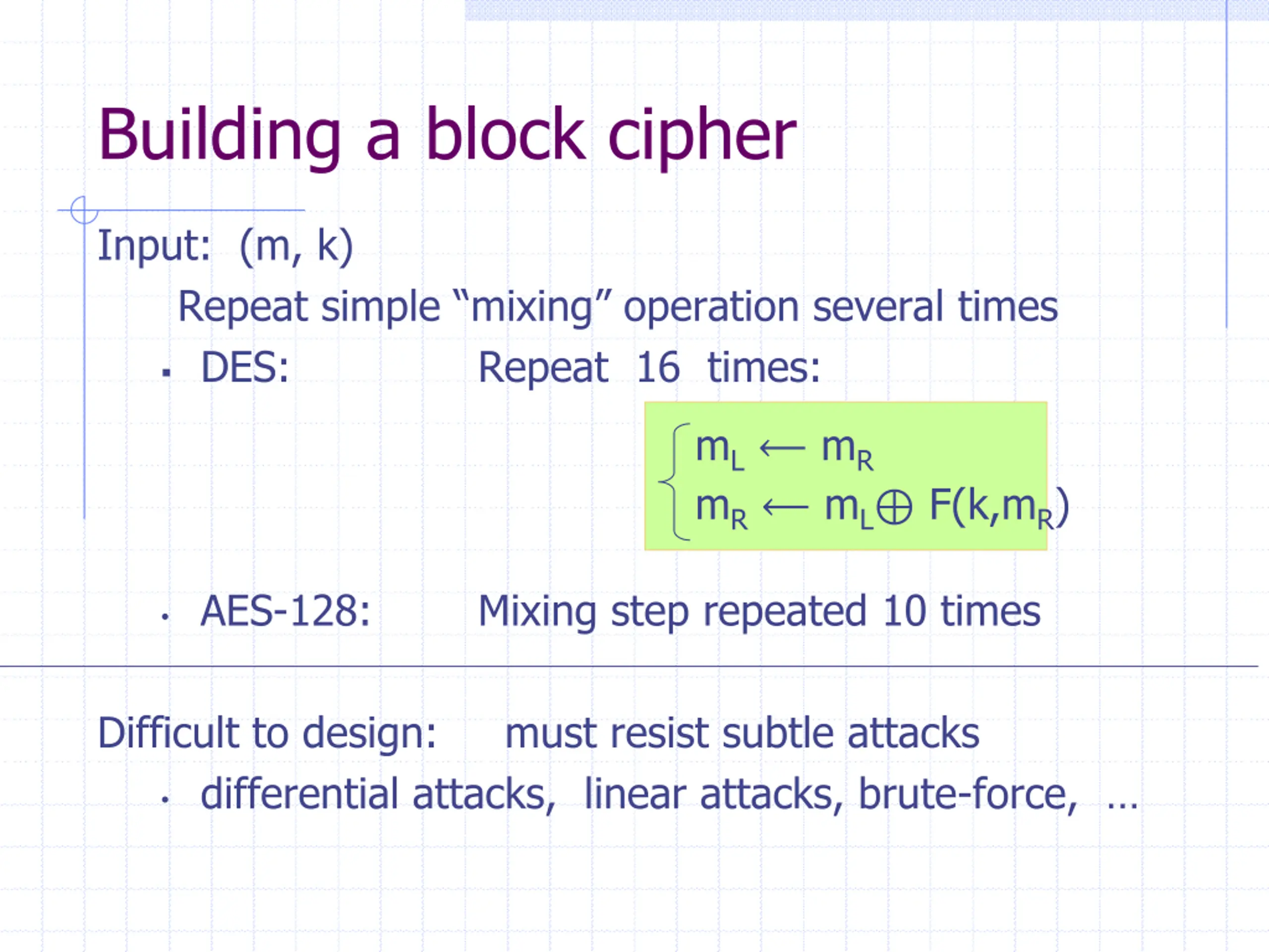 Building a block cipher Input: (m, k) Repeat simple mixing operation several times DES: Repeat 16 times: mL mR mR mL F(k,mR) AES-128: Mixing step repeated 10 times Difficult to design: must resist subtle attacks differential attacks, linear attacks, brute-force,
