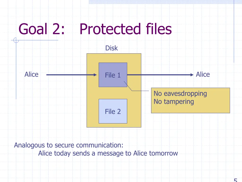 Goal 2: Protected files Disk Alice Alice File 1 No eavesdropping No tampering File 2 Analogous to secure communication: Alice today sends a message to Alice tomorrow 5
