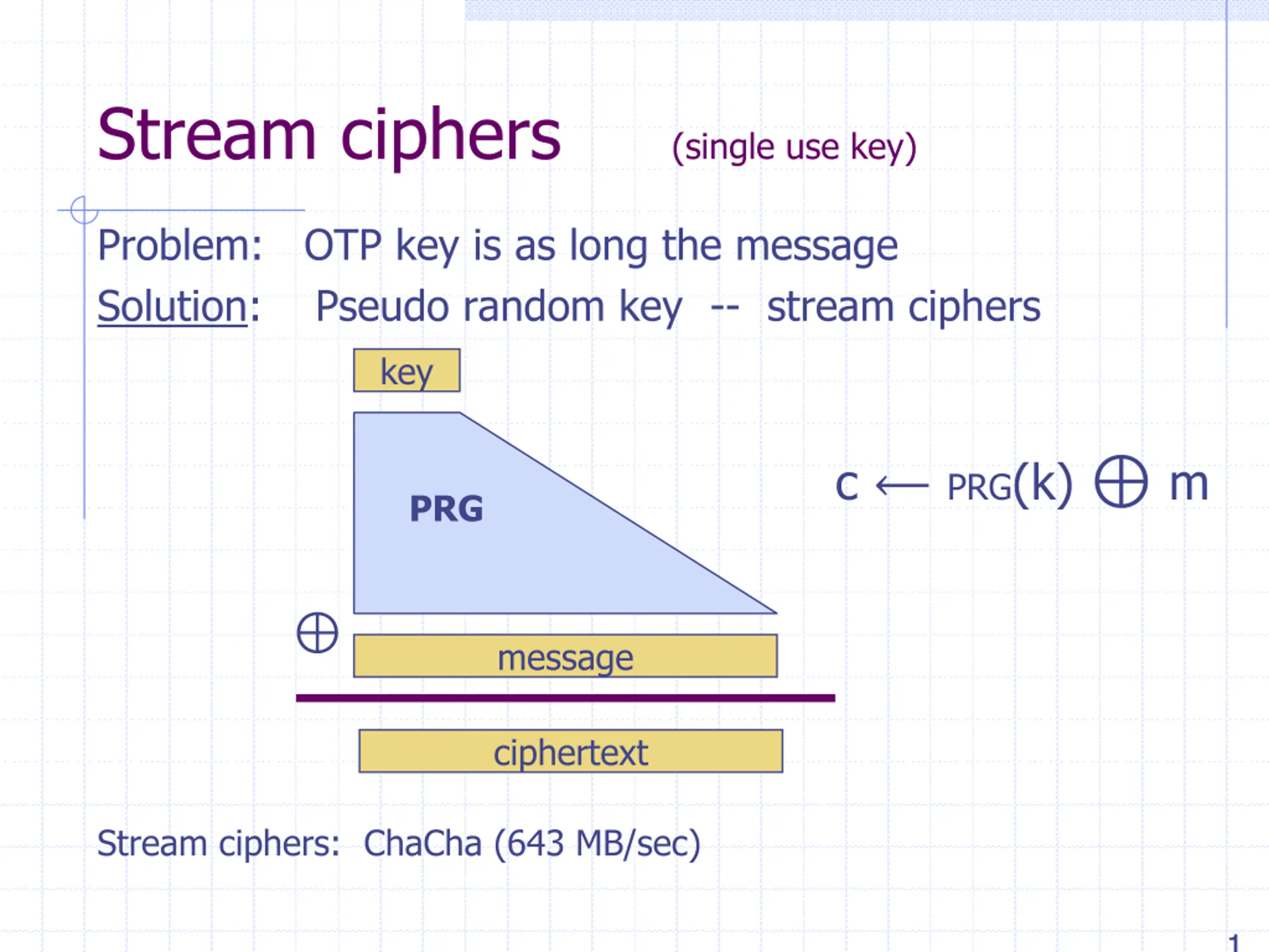 Stream ciphers (single use key) Problem: OTP key is as long the message Solution: Pseudo random key -- stream ciphers key c PRG(k) m PRG message ciphertext Stream ciphers: ChaCha (643 MB/sec) 1