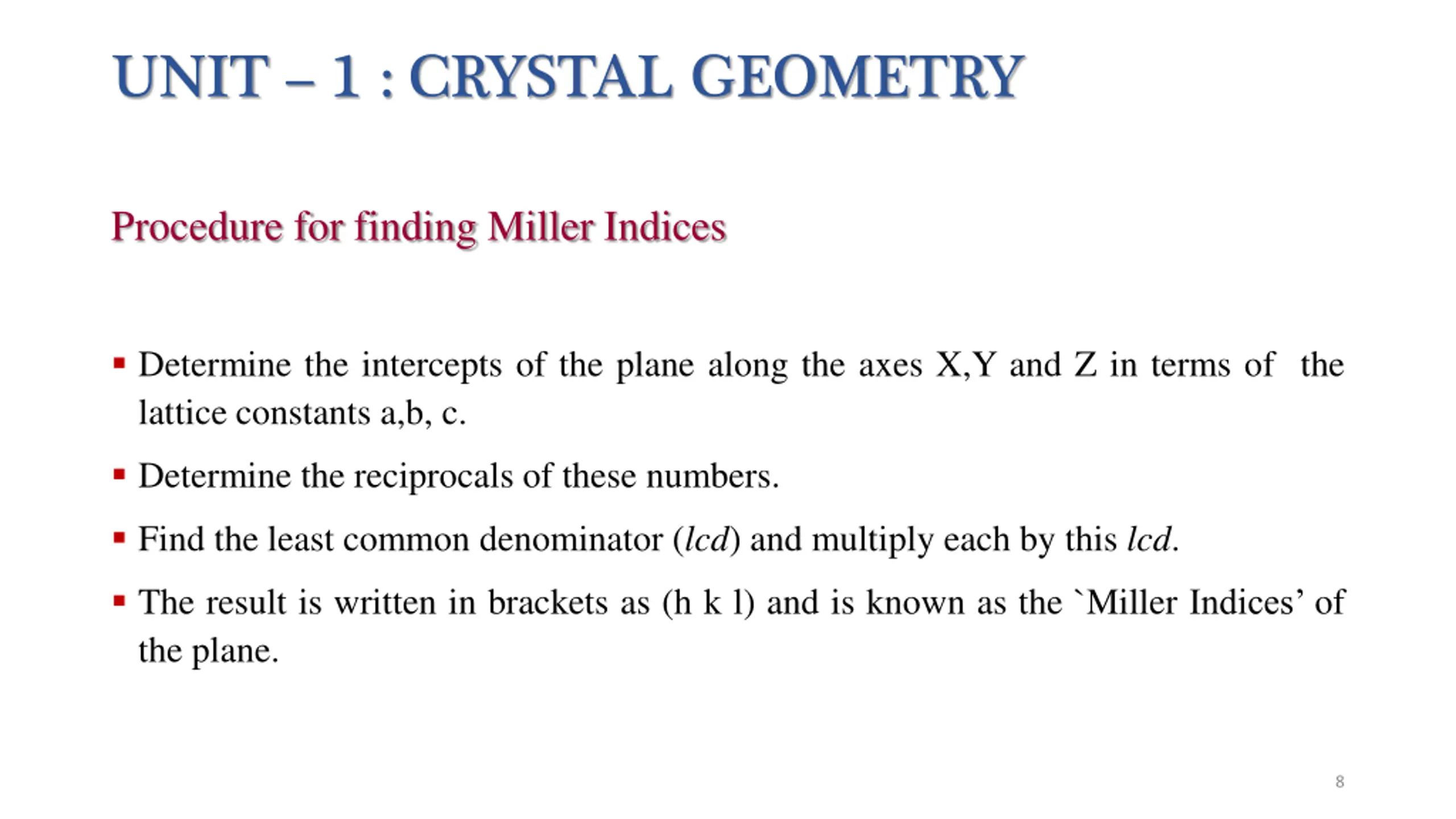 UNIT 1 : CRYSTAL GEOMETRY CRYSTAL PLANES AND MILLER INDICES The orientation of planes or faces in a crystal can be described in terms of their intercepts on the three axes. Miller introduced a system to designate a plane in a crystal. He introduced a set of three numbers to specify a plane in a crystal. This set of three numbers is known as MillerIndices of the concerned plane. Miller indices are defined as the reciprocals of the intercepts made by the plane on the three axes. 7