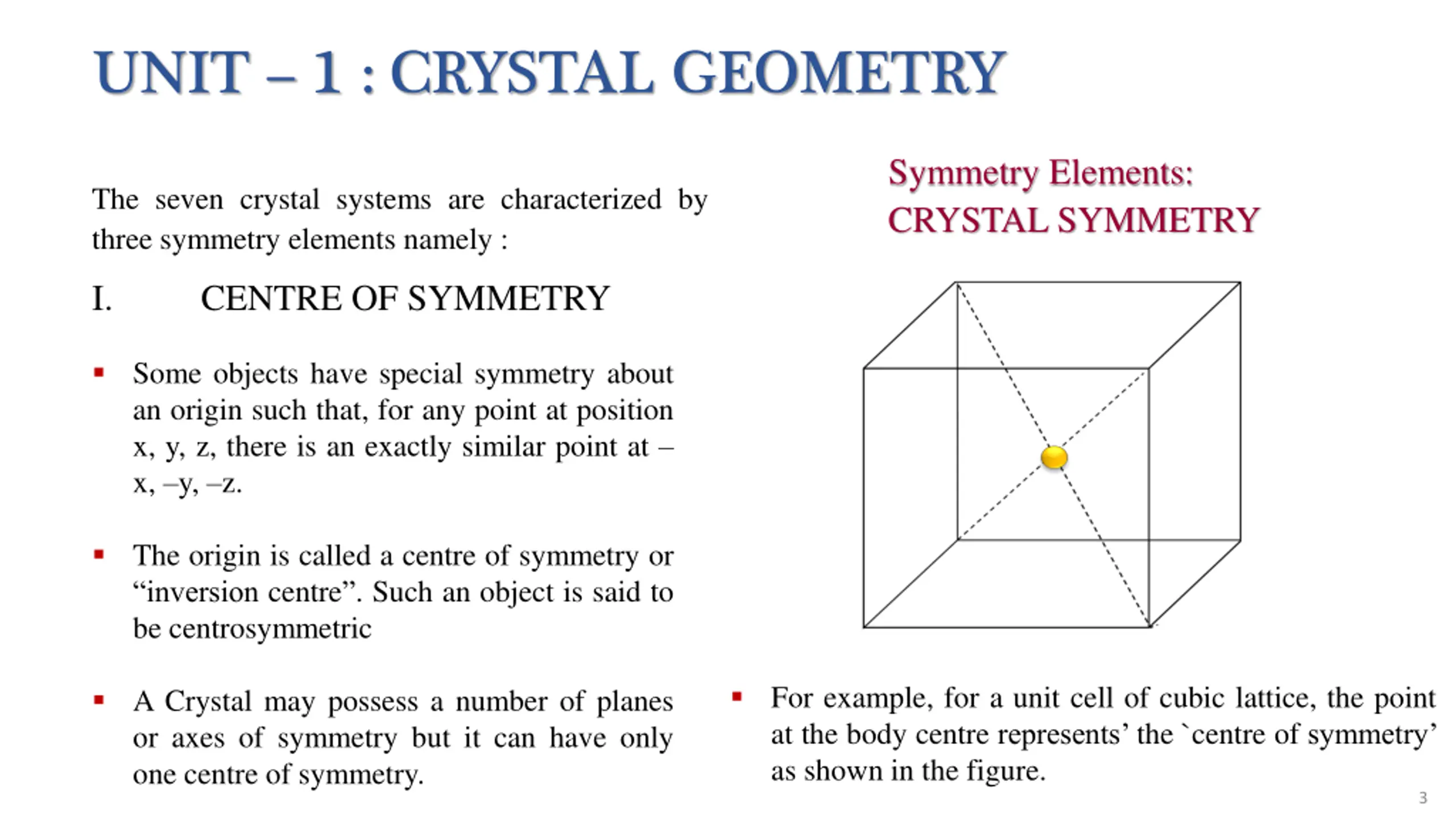 UNIT 1 : CRYSTAL GEOMETRY Symmetry Elements: CRYSTAL SYMMETRY The seven crystal systems are characterized by three symmetry elements namely : I. CENTRE OF SYMMETRY Some objects have special symmetry about an origin such that, for any point at position x, y, z, there is an exactly similar point at x, y, z. The origin is called a centre of symmetry or inversion centre . Such an object is said to be centrosymmetric For example, for a unit cell of cubic lattice, the point at the body centre represents the `centre of symmetry as shown in the figure. A Crystal may possess a number of planes or axes of symmetry but it can have only one centre of symmetry. 3
