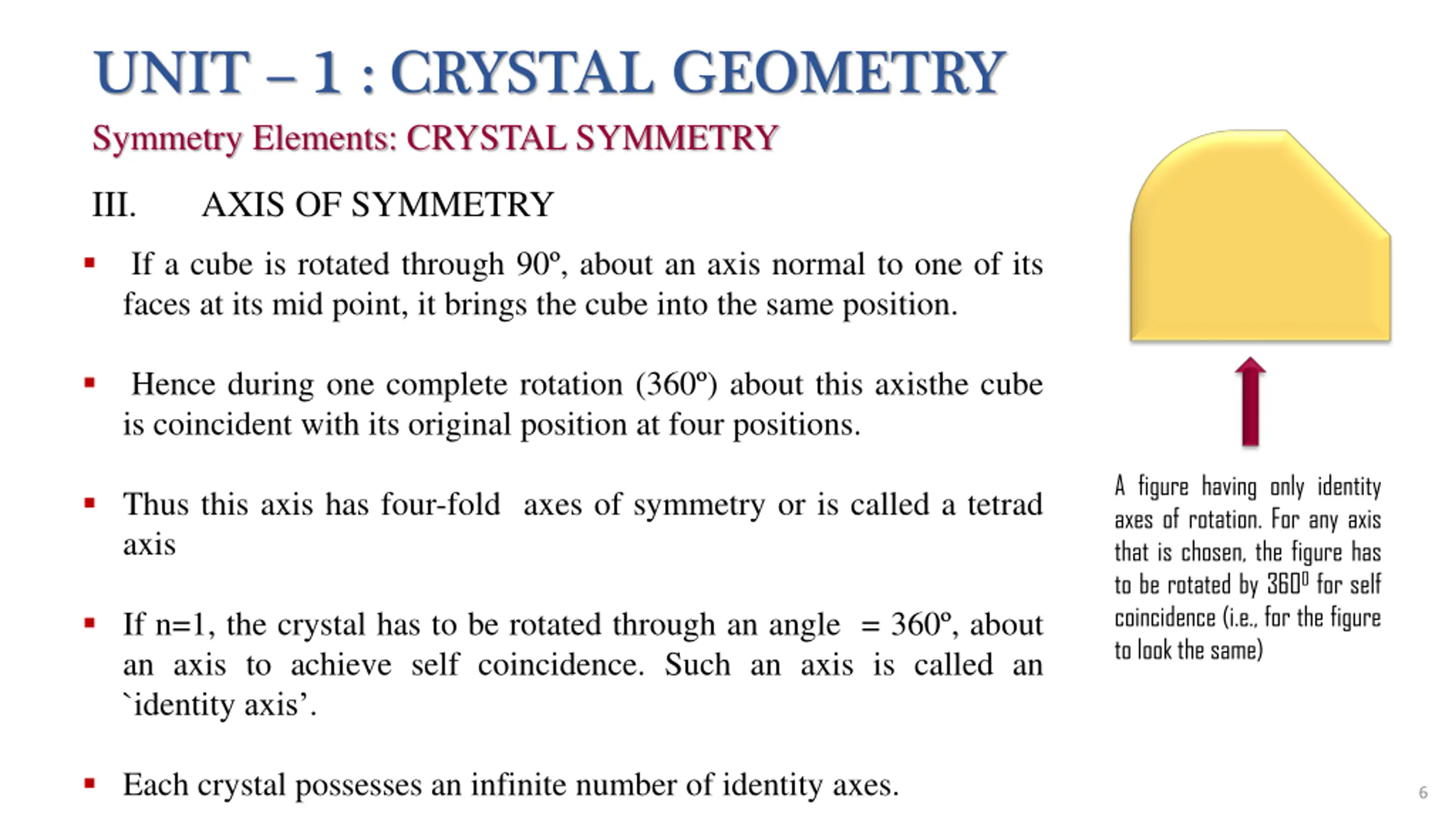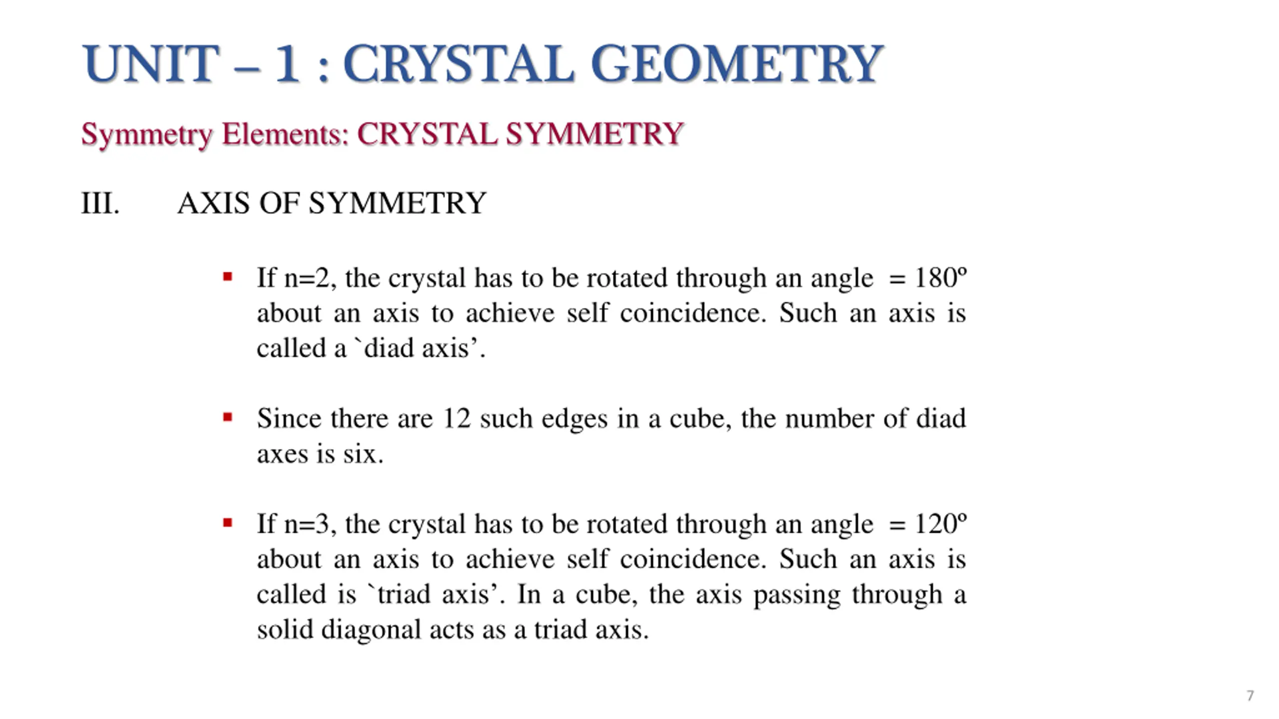 UNIT 1 : CRYSTAL GEOMETRY Symmetry Elements: CRYSTAL SYMMETRY III. AXIS OF SYMMETRY If a cube is rotated through 90 , about an axis normal to one of its faces at its mid point, it brings the cube into the same position. Hence during one complete rotation (360 ) about this axisthe cube is coincident with its original position at four positions. A figure having only identity axes of rotation. For any axis that is chosen, the figure has to be rotated by 3600 for self coincidence (i.e., for the figure to look the same) Thus this axis has four-fold axes of symmetry or is called a tetrad axis If n=1, the crystal has to be rotated through an angle = 360 , about an axis to achieve self coincidence. Such an axis is called an `identity axis . Each crystal possesses an infinite number of identity axes. 6