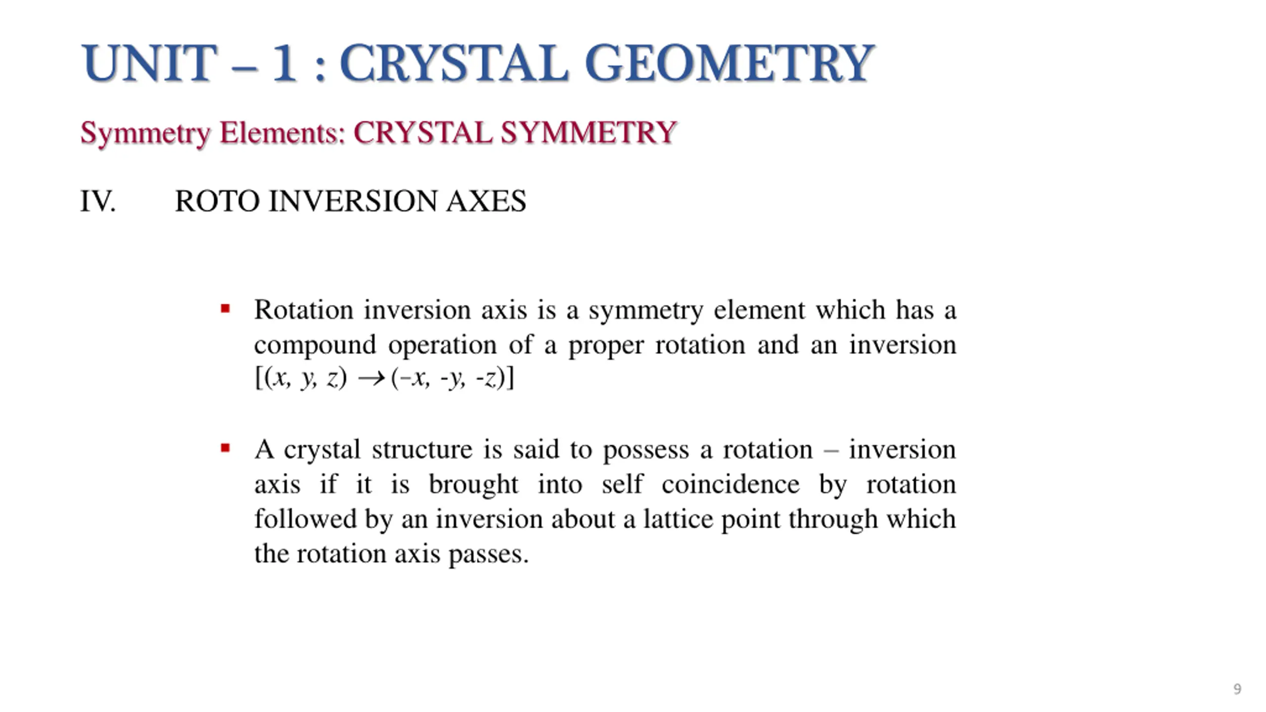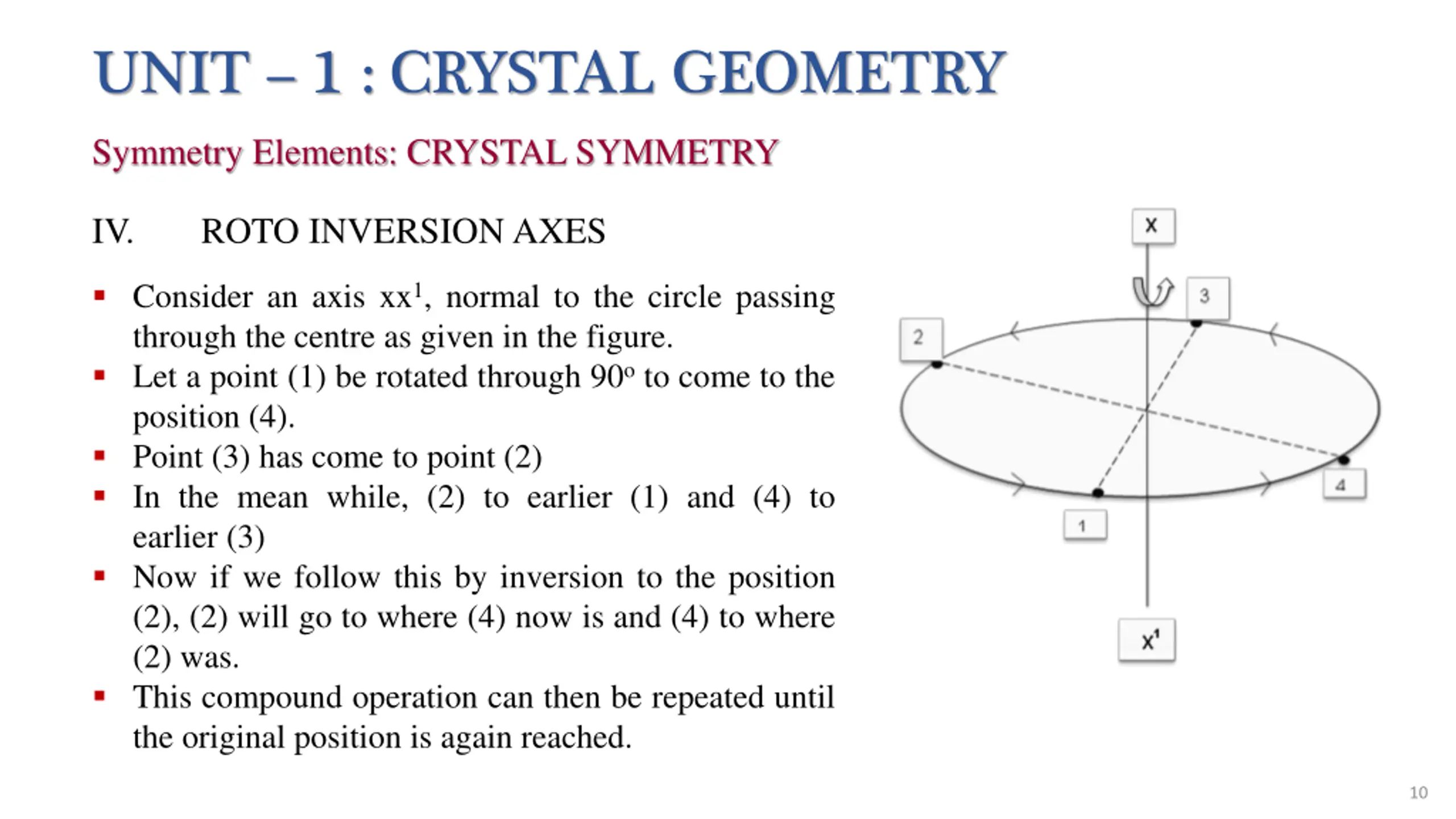 UNIT 1 : CRYSTAL GEOMETRY Symmetry Elements: CRYSTAL SYMMETRY IV. ROTO INVERSION AXES Rotation inversion axis is a symmetry element which has a compound operation of a proper rotation and an inversion [(x, y, z) (-x, -y, -z)] A crystal structure is said to possess a rotation inversion axis if it is brought into self coincidence by rotation followed by an inversion about a lattice point through which the rotation axis passes. 9