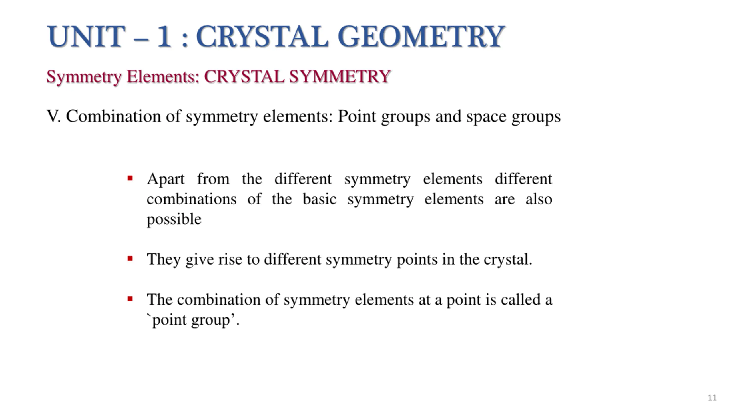 UNIT 1 : CRYSTAL GEOMETRY Symmetry Elements: CRYSTAL SYMMETRY V. Combination of symmetry elements: Point groups and space groups Apart from the different symmetry elements different combinations of the basic symmetry elements are also possible They give rise to different symmetry points in the crystal. The combination of symmetry elements at a point is called a `point group . 11