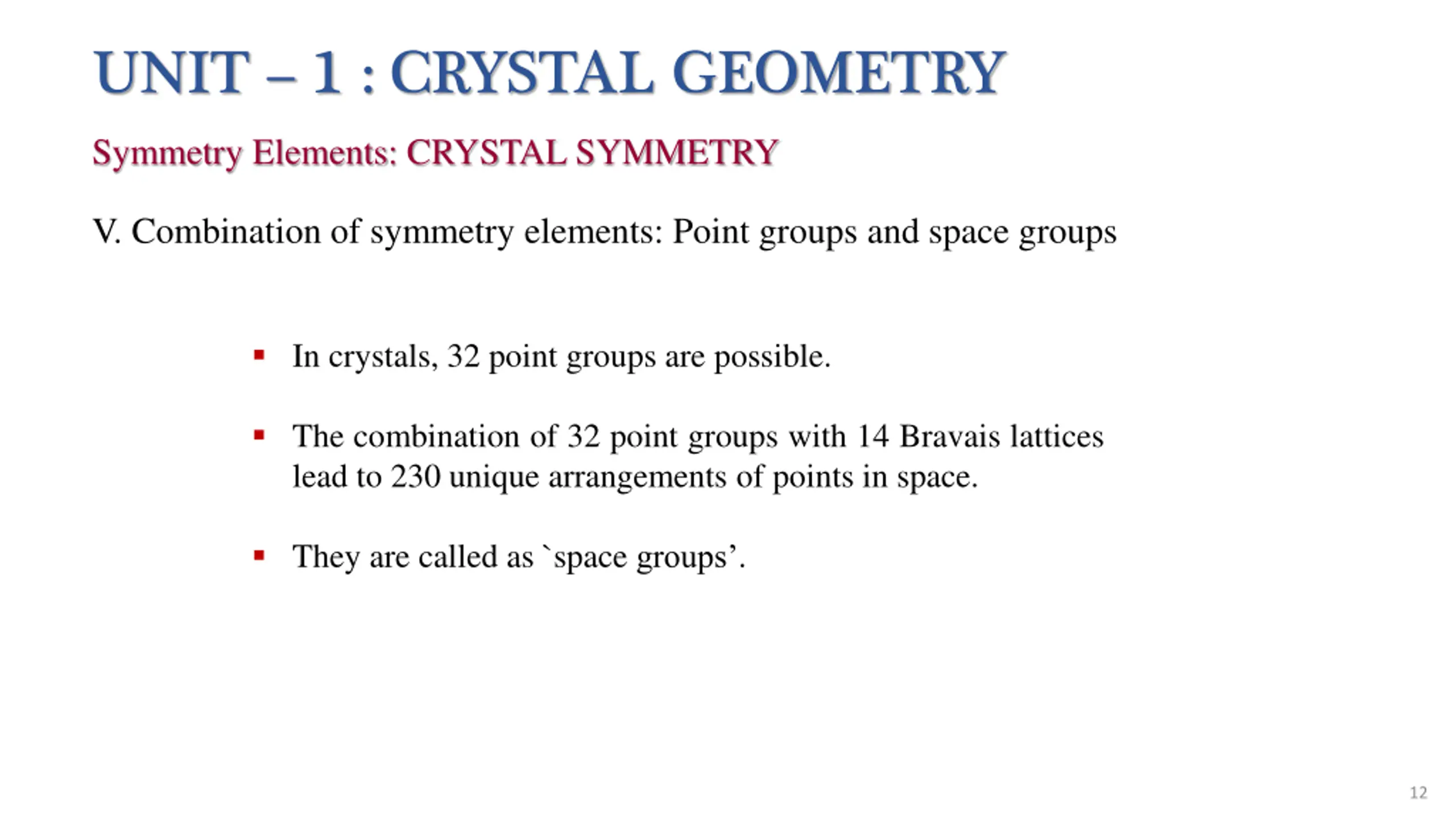 UNIT 1 : CRYSTAL GEOMETRY Symmetry Elements: CRYSTAL SYMMETRY V. Combination of symmetry elements: Point groups and space groups In crystals, 32 point groups are possible. The combination of 32 point groups with 14 Bravais lattices lead to 230 unique arrangements of points in space. They are called as `space groups . 12