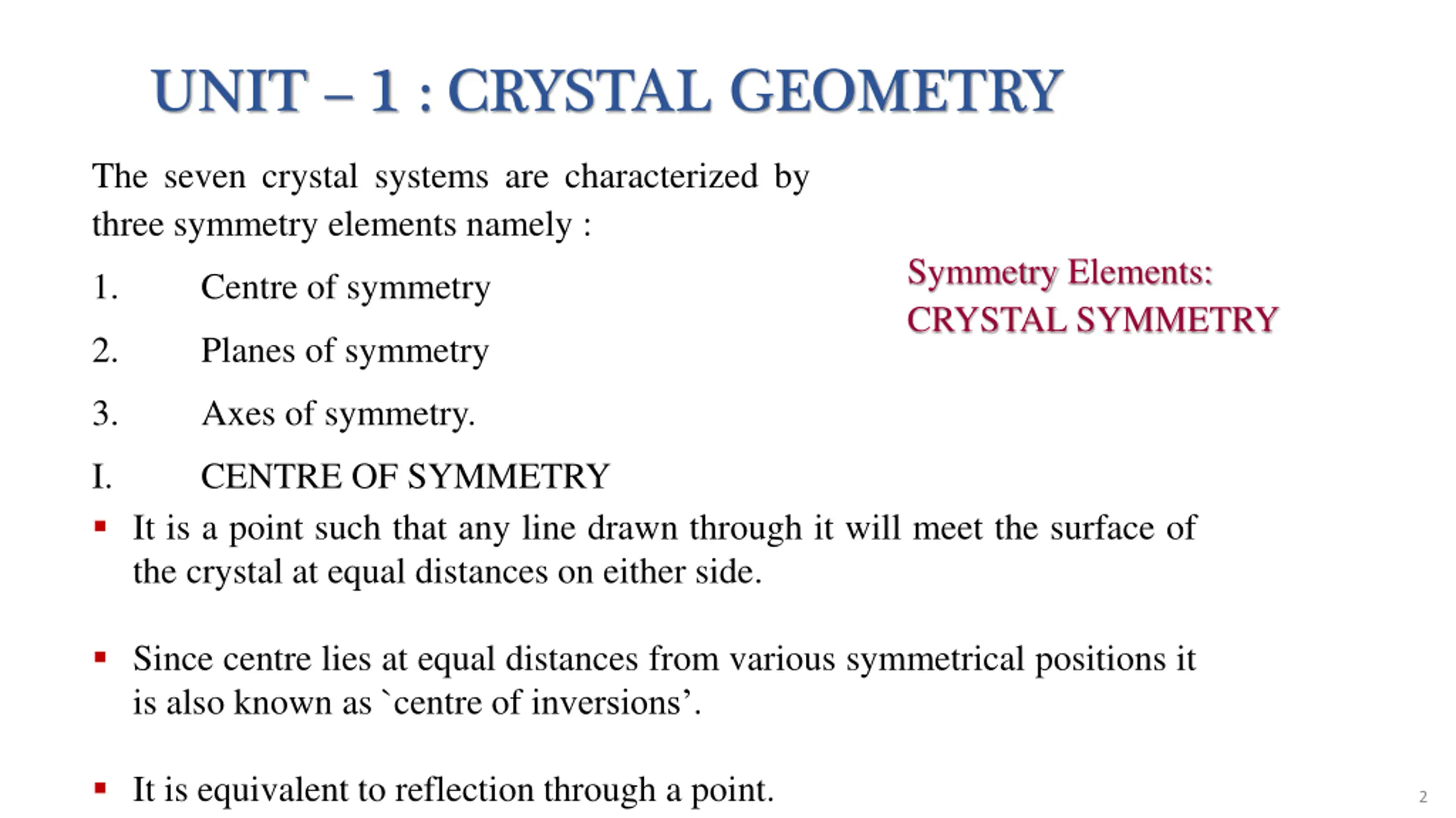 UNIT 1 : CRYSTAL GEOMETRY The seven crystal systems are characterized by three symmetry elements namely : Symmetry Elements: CRYSTAL SYMMETRY 1. Centre of symmetry 2. Planes of symmetry 3. Axes of symmetry. I. It is a point such that any line drawn through it will meet the surface of the crystal at equal distances on either side. Since centre lies at equal distances from various symmetrical positions it is also known as `centre of inversions . CENTRE OF SYMMETRY It is equivalent to reflection through a point. 2