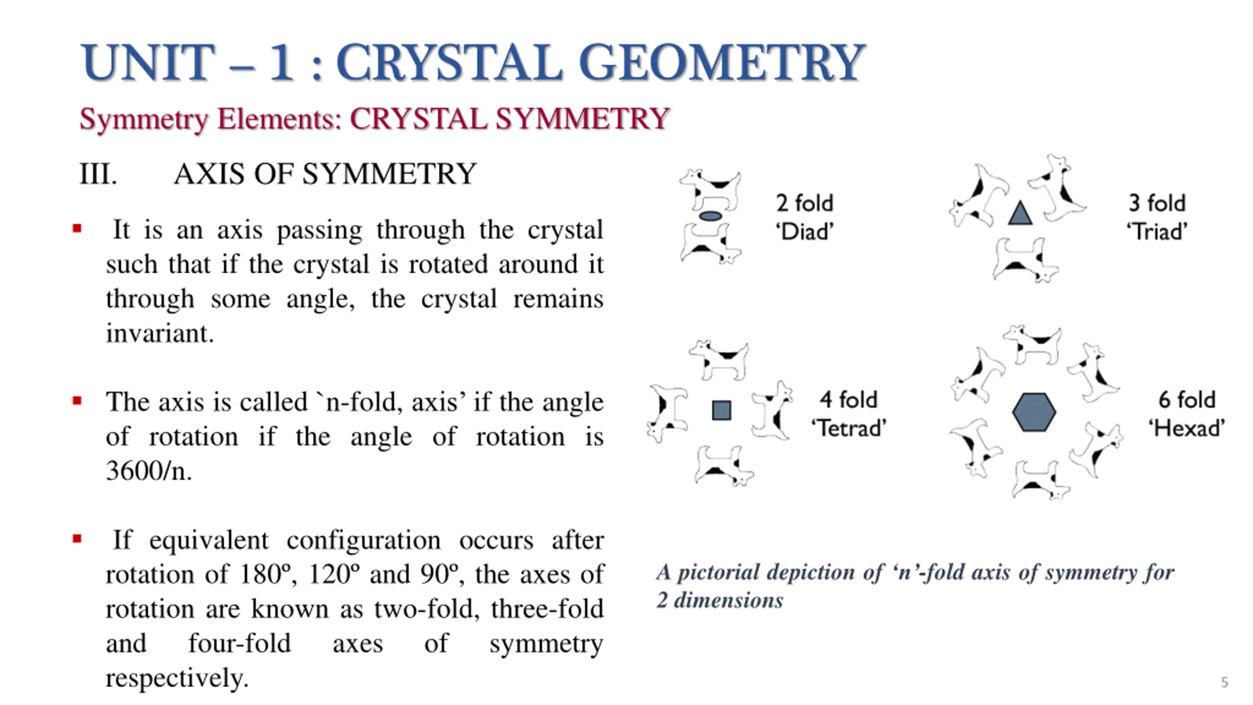 UNIT 1 : CRYSTAL GEOMETRY Symmetry Elements: CRYSTAL SYMMETRY III. AXIS OF SYMMETRY It is an axis passing through the crystal such that if the crystal is rotated around it through some angle, the crystal remains invariant. The axis is called `n-fold, axis if the angle of rotation if the angle of rotation is 3600/n. If equivalent configuration occurs after rotation of 180 , 120 and 90 , the axes of rotation are known as two-fold, three-fold and four-fold axes respectively. A pictorial depiction of n -fold axis of symmetry for 2 dimensions of symmetry 5