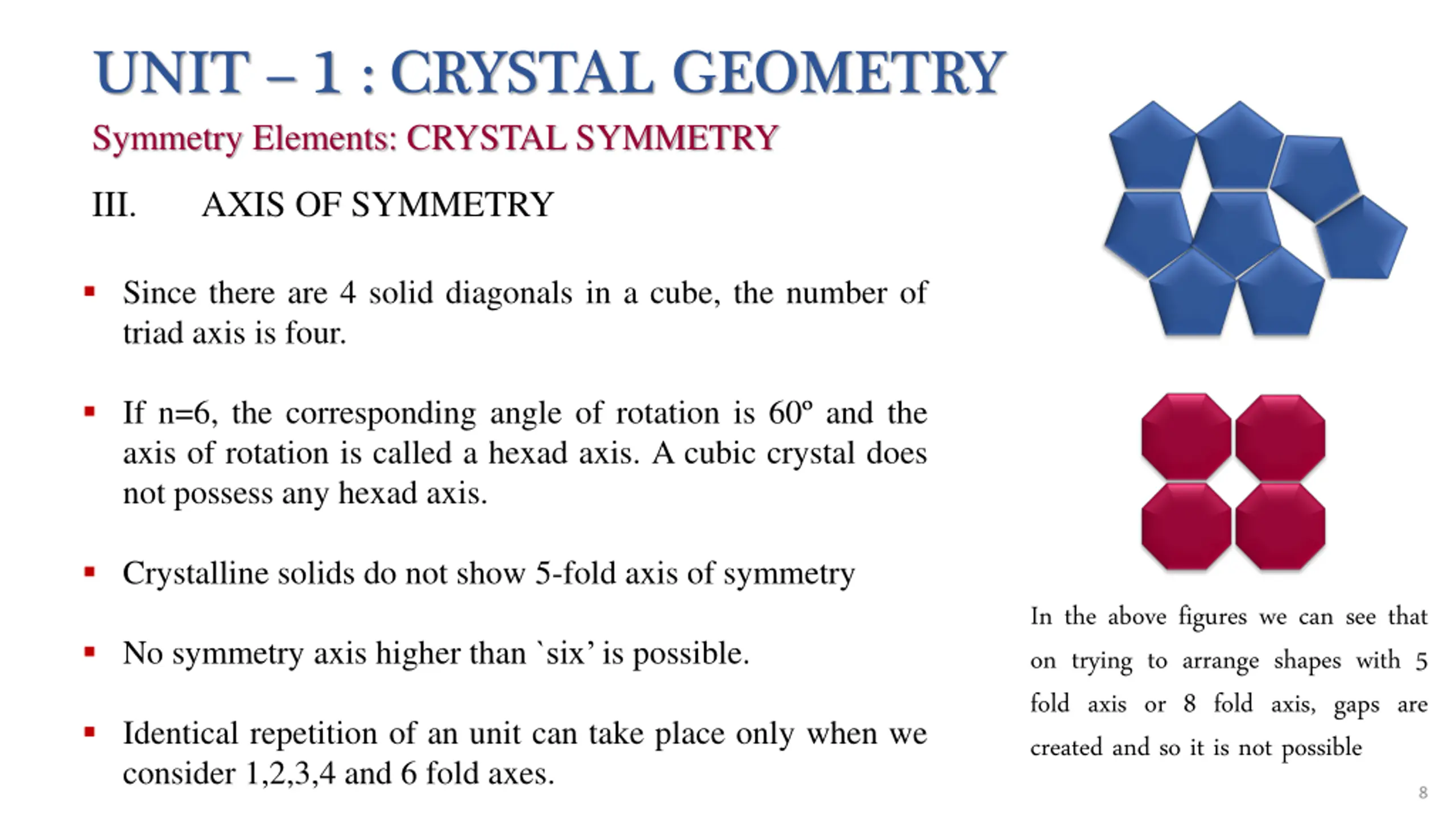 UNIT 1 : CRYSTAL GEOMETRY Symmetry Elements: CRYSTAL SYMMETRY III. AXIS OF SYMMETRY Since there are 4 solid diagonals in a cube, the number of triad axis is four. If n=6, the corresponding angle of rotation is 60 and the axis of rotation is called a hexad axis. A cubic crystal does not possess any hexad axis. Crystalline solids do not show 5-fold axis of symmetry No symmetry axis higher than `six is possible. In the above figures we can see that on trying to arrange shapes with 5 fold axis or 8 fold axis, gaps are created and so it is not possible Identical repetition of an unit can take place only when we consider 1,2,3,4 and 6 fold axes. 8