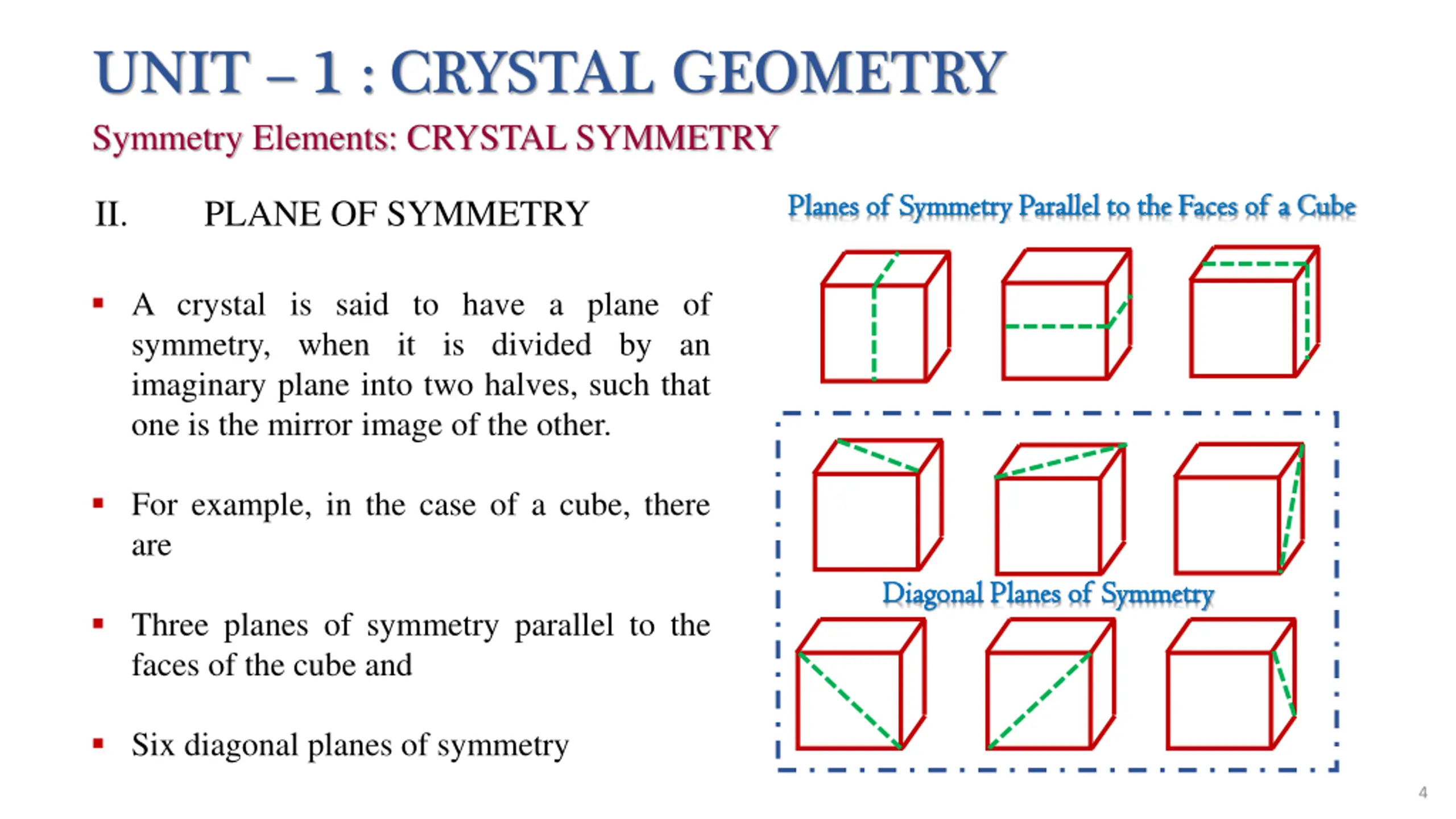 UNIT 1 : CRYSTAL GEOMETRY Symmetry Elements: CRYSTAL SYMMETRY Planes Planes of of Symmetry Parallel to the Faces of a Cube Symmetry Parallel to the Faces of a Cube II. PLANE OF SYMMETRY A crystal is said to have a plane of symmetry, when it is divided by an imaginary plane into two halves, such that one is the mirror image of the other. For example, in the case of a cube, there are Diagonal Planes of Symmetry Diagonal Planes of Symmetry Three planes of symmetry parallel to the faces of the cube and Six diagonal planes of symmetry 4