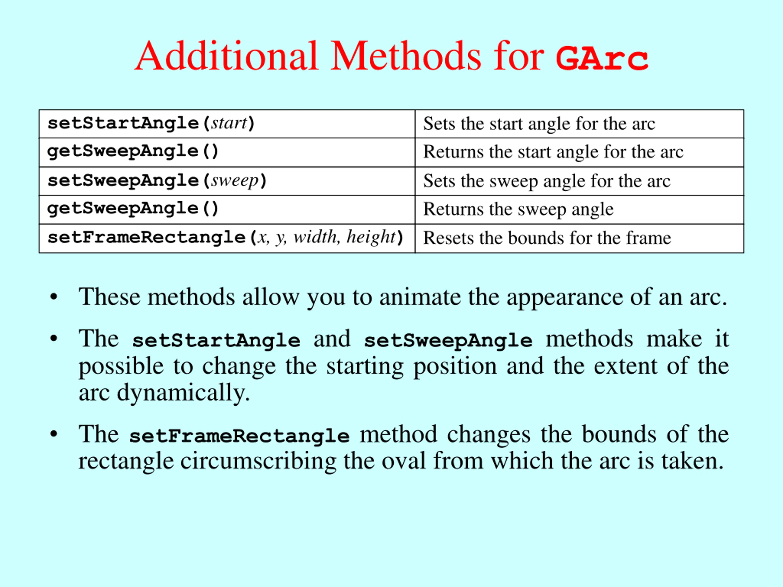 Additional Methods for GArc setStartAngle(start) getSweepAngle() setSweepAngle(sweep) getSweepAngle() setFrameRectangle(x, y, width, height) Resets the bounds for the frame Sets the start angle for the arc Returns the start angle for the arc Sets the sweep angle for the arc Returns the sweep angle These methods allow you to animate the appearance of an arc. The setStartAngle and setSweepAngle methods make it possible to change the starting position and the extent of the arc dynamically. The setFrameRectangle method changes the bounds of the rectangle circumscribing the oval from which the arc is taken.