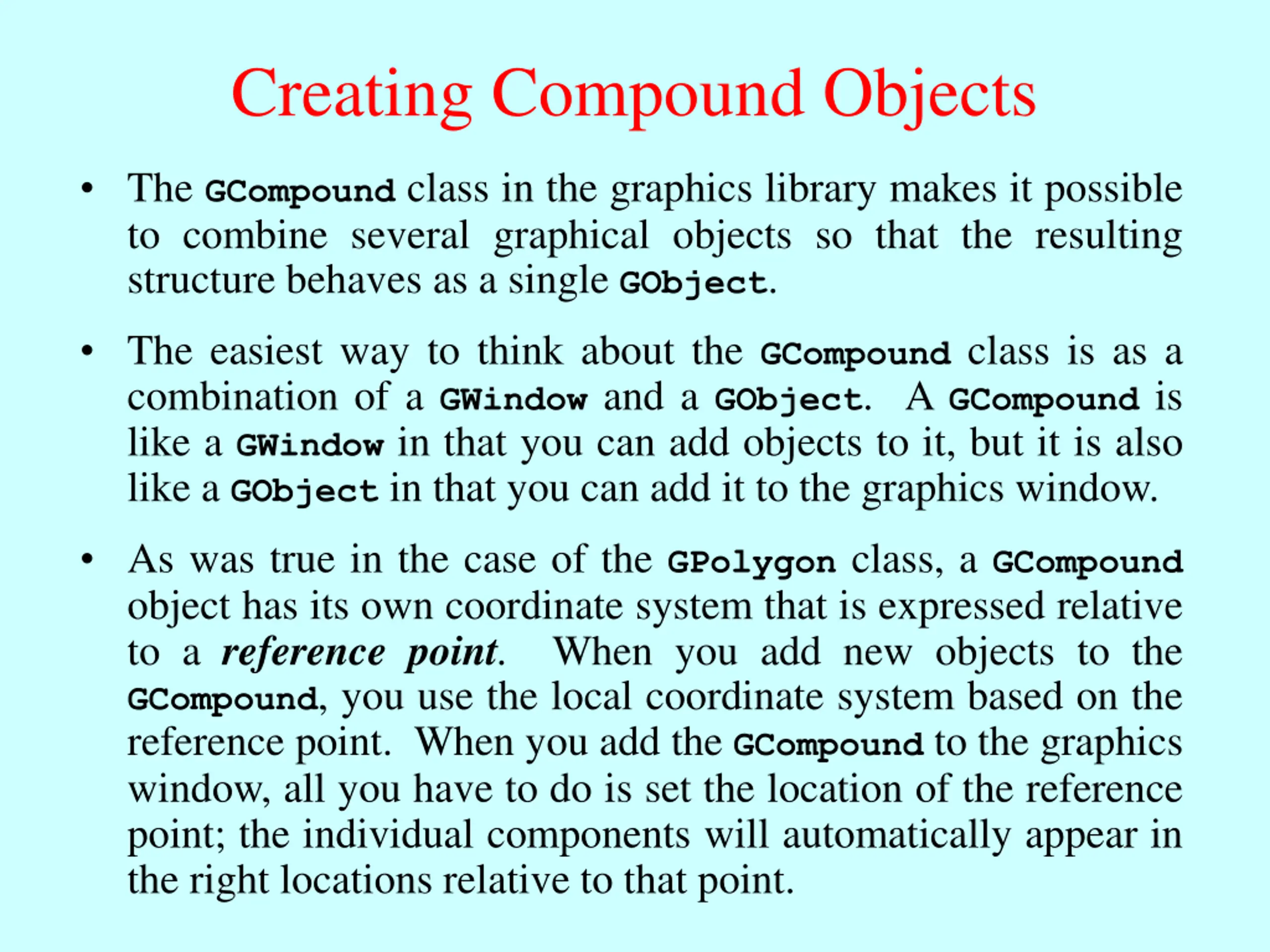 Creating Compound Objects The GCompound class in the graphics library makes it possible to combine several graphical objects so that the resulting structure behaves as a single GObject. The easiest way to think about the GCompound class is as a combination of a GWindow and a GObject. A GCompound is like a GWindow in that you can add objects to it, but it is also like a GObject in that you can add it to the graphics window. As was true in the case of the GPolygon class, a GCompound object has its own coordinate system that is expressed relative to a reference point. When you add new objects to the GCompound, you use the local coordinate system based on the reference point. When you add the GCompound to the graphics window, all you have to do is set the location of the reference point; the individual components will automatically appear in the right locations relative to that point.
