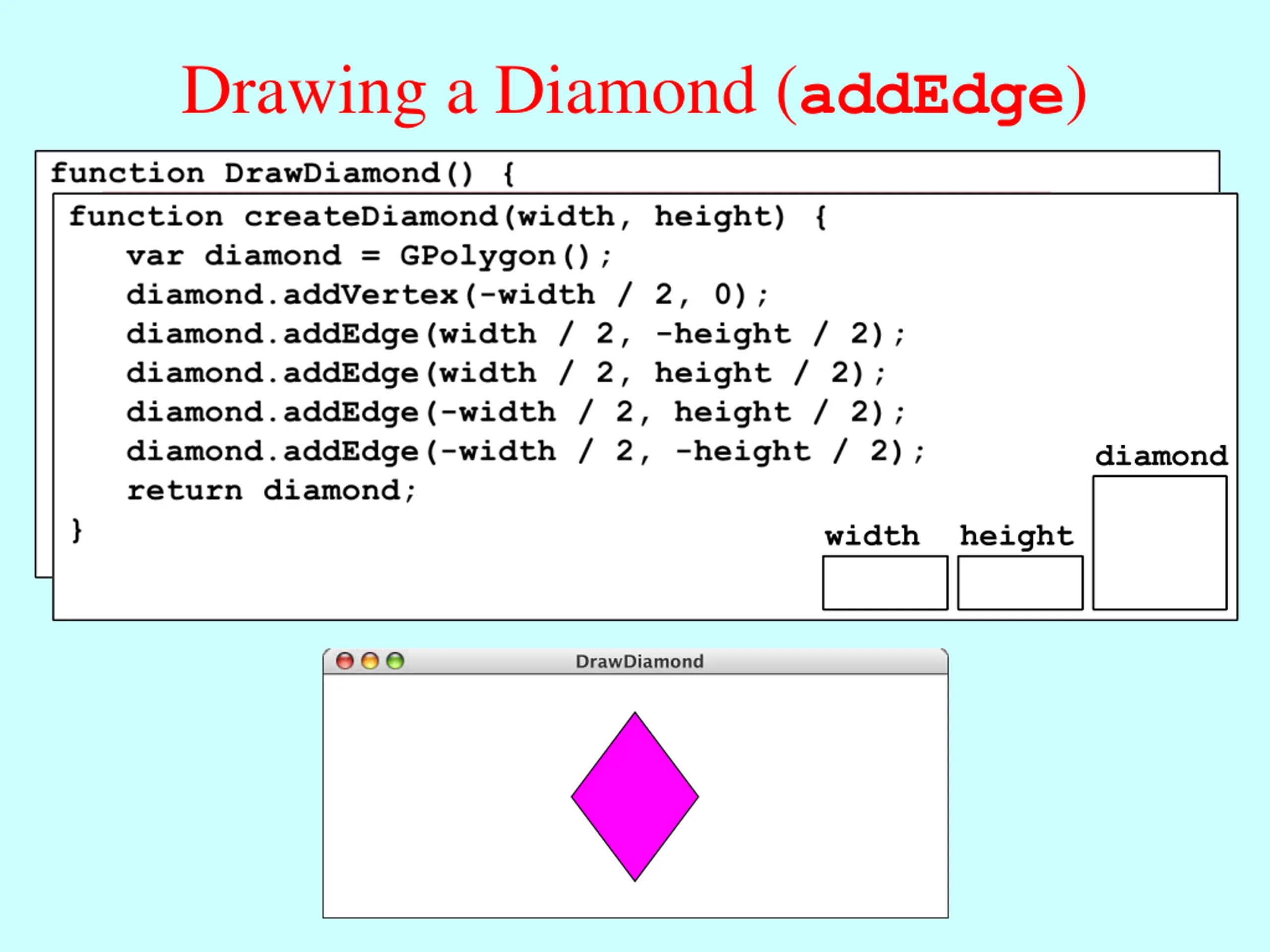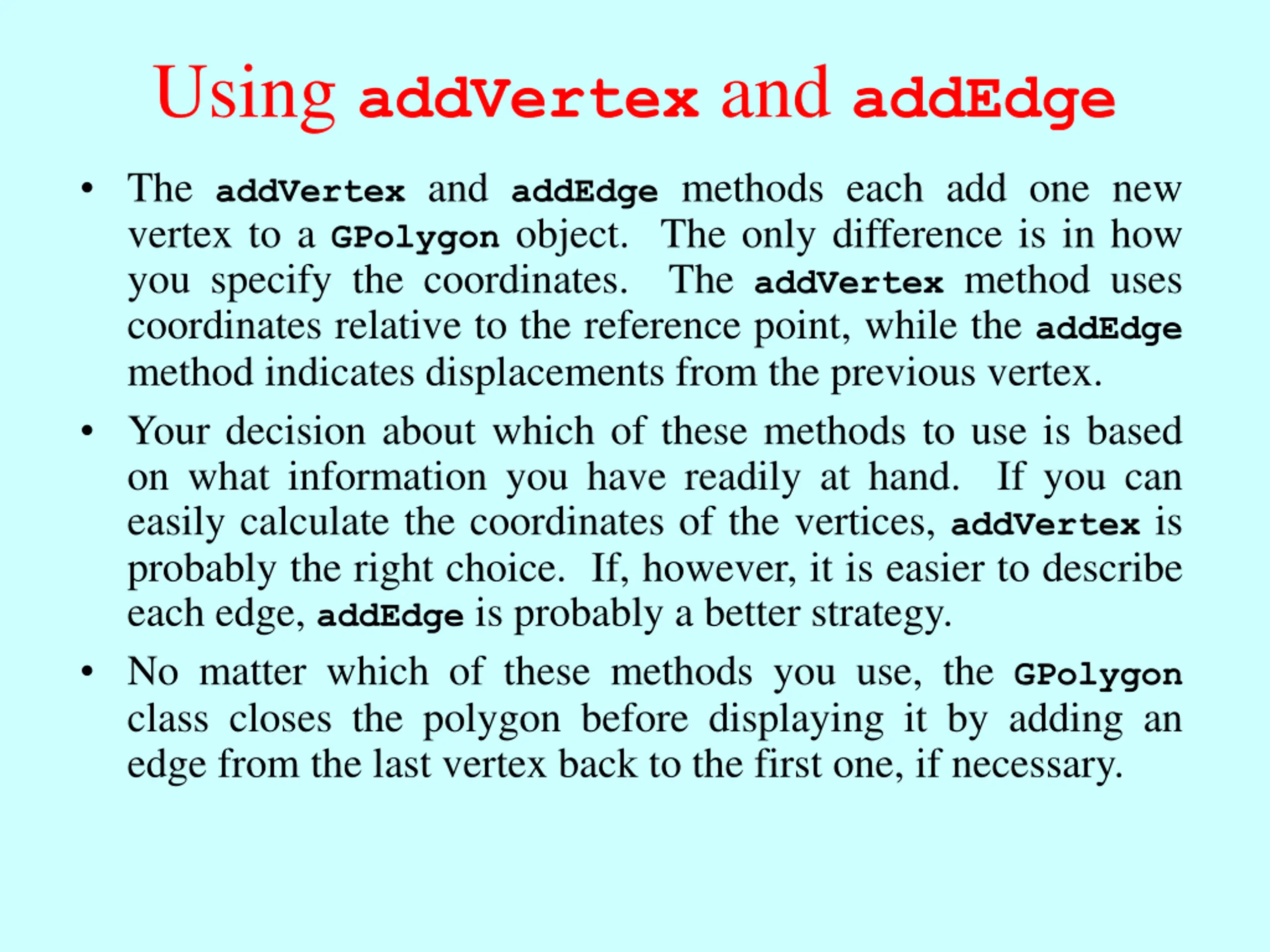 UsingaddVertex andaddEdge The addVertex and addEdge methods each add one new vertex to a GPolygon object. The only difference is in how you specify the coordinates. The addVertex method uses coordinates relative to the reference point, while the addEdge method indicates displacements from the previous vertex. Your decision about which of these methods to use is based on what information you have readily at hand. If you can easily calculate the coordinates of the vertices, addVertex is probably the right choice. If, however, it is easier to describe each edge, addEdge is probably a better strategy. No matter which of these methods you use, the GPolygon class closes the polygon before displaying it by adding an edge from the last vertex back to the first one, if necessary.