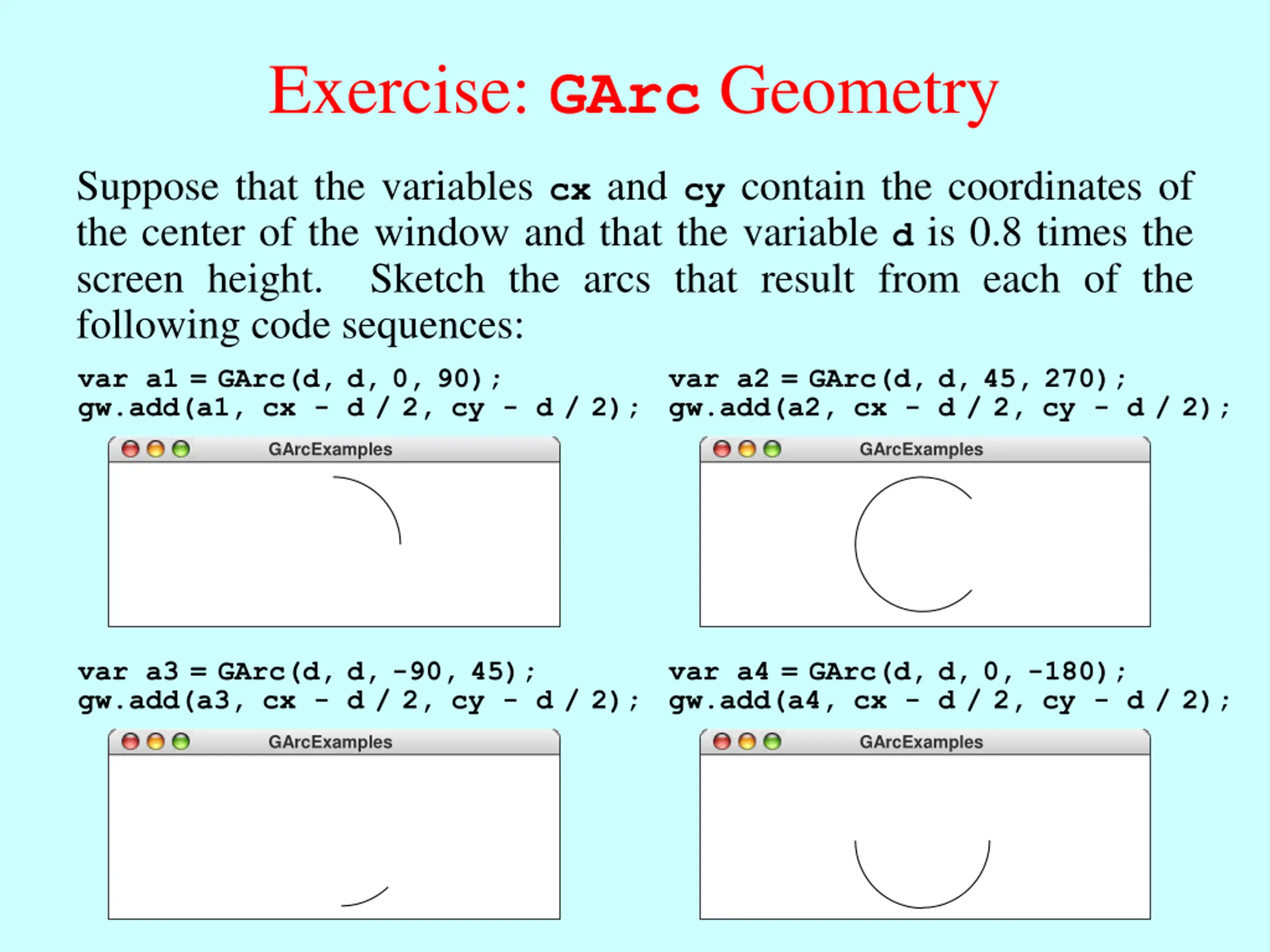 Exercise: GArc Geometry Suppose that the variables cx and cy contain the coordinates of the center of the window and that the variable d is 0.8 times the screen height. Sketch the arcs that result from each of the following code sequences: var a1=GArc(d,d,0,90); gw.add(a1,cx - d/2,cy - d/2); var a2=GArc(d,d,45,270); gw.add(a2,cx - d/2,cy - d/2); GArcExamples GArcExamples var a3=GArc(d,d,-90,45); gw.add(a3,cx - d/2,cy - d/2); var a4=GArc(d,d,0,-180); gw.add(a4,cx - d/2,cy - d/2); GArcExamples GArcExamples