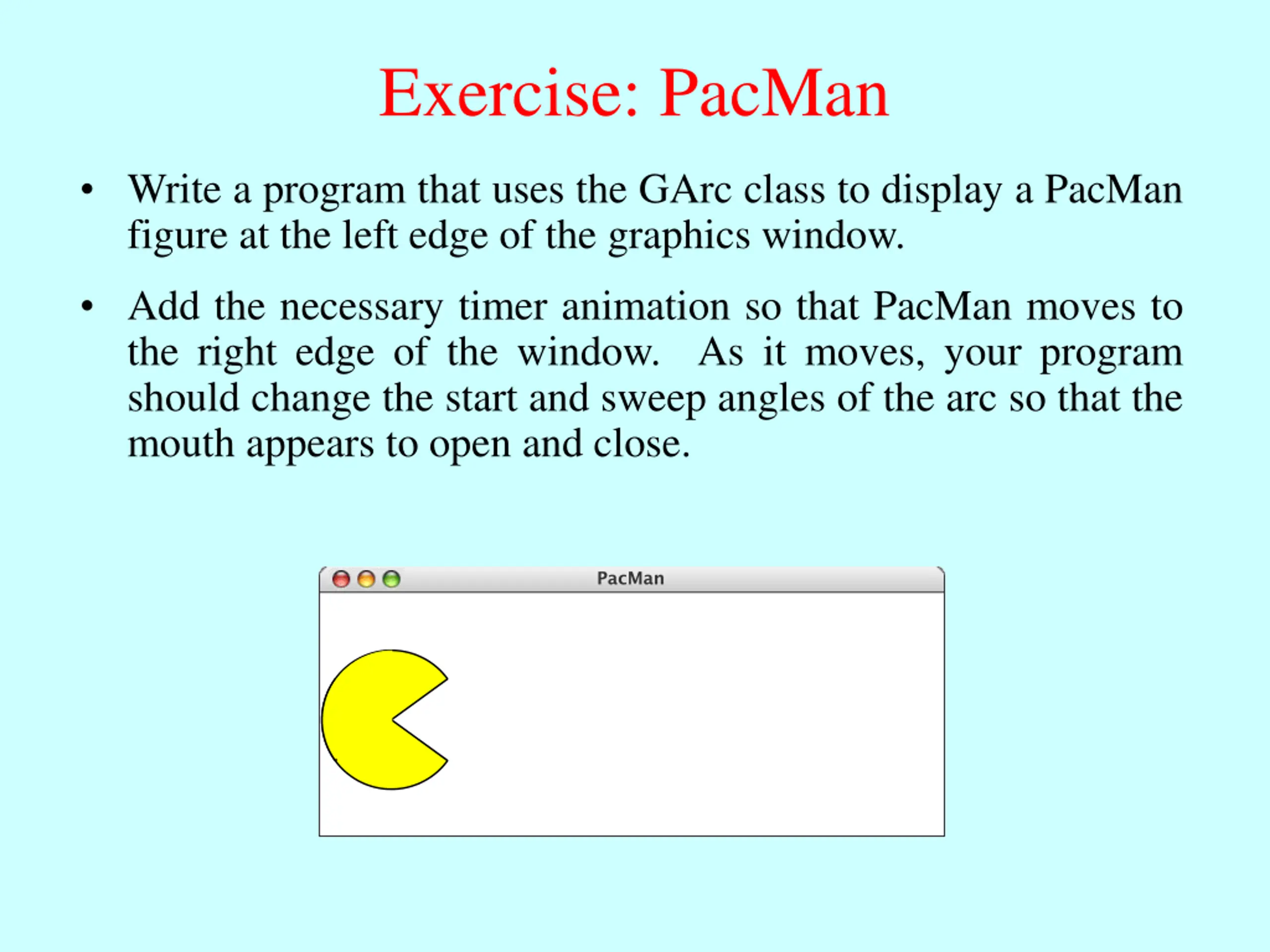 Exercise: PacMan Write a program that uses the GArc class to display a PacMan figure at the left edge of the graphics window. Add the necessary timer animation so that PacMan moves to the right edge of the window. As it moves, your program should change the start and sweep angles of the arc so that the mouth appears to open and close. PacMan