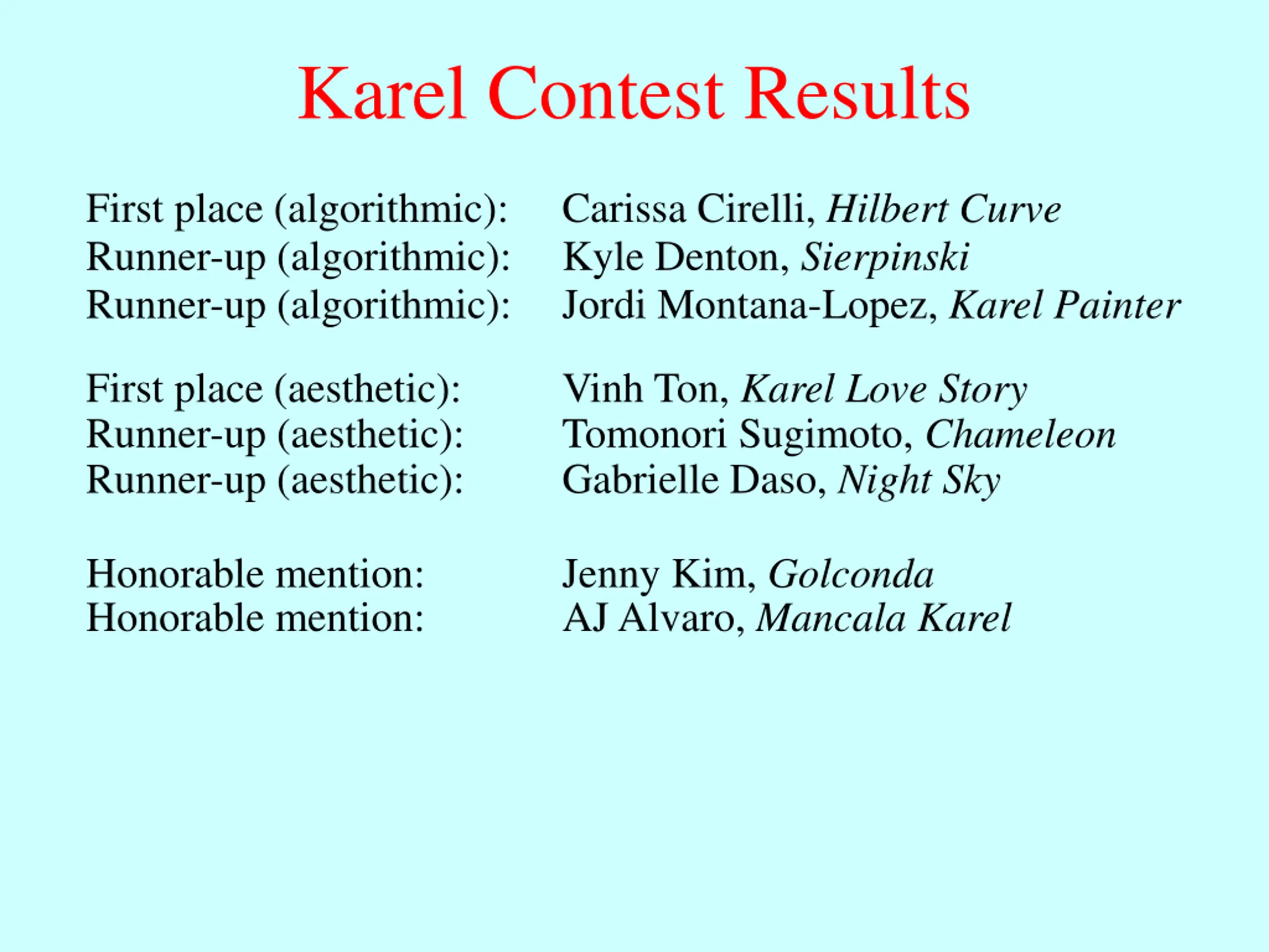 Karel Contest Results First place (algorithmic): Runner-up (algorithmic): Carissa Cirelli, Hilbert Curve Kyle Denton, Sierpinski Runner-up (algorithmic): Jordi Montana-Lopez, Karel Painter First place (aesthetic): Runner-up (aesthetic): Vinh Ton, Karel Love Story Tomonori Sugimoto, Chameleon Runner-up (aesthetic): Gabrielle Daso, Night Sky Honorable mention: Jenny Kim, Golconda Honorable mention: AJ Alvaro, Mancala Karel