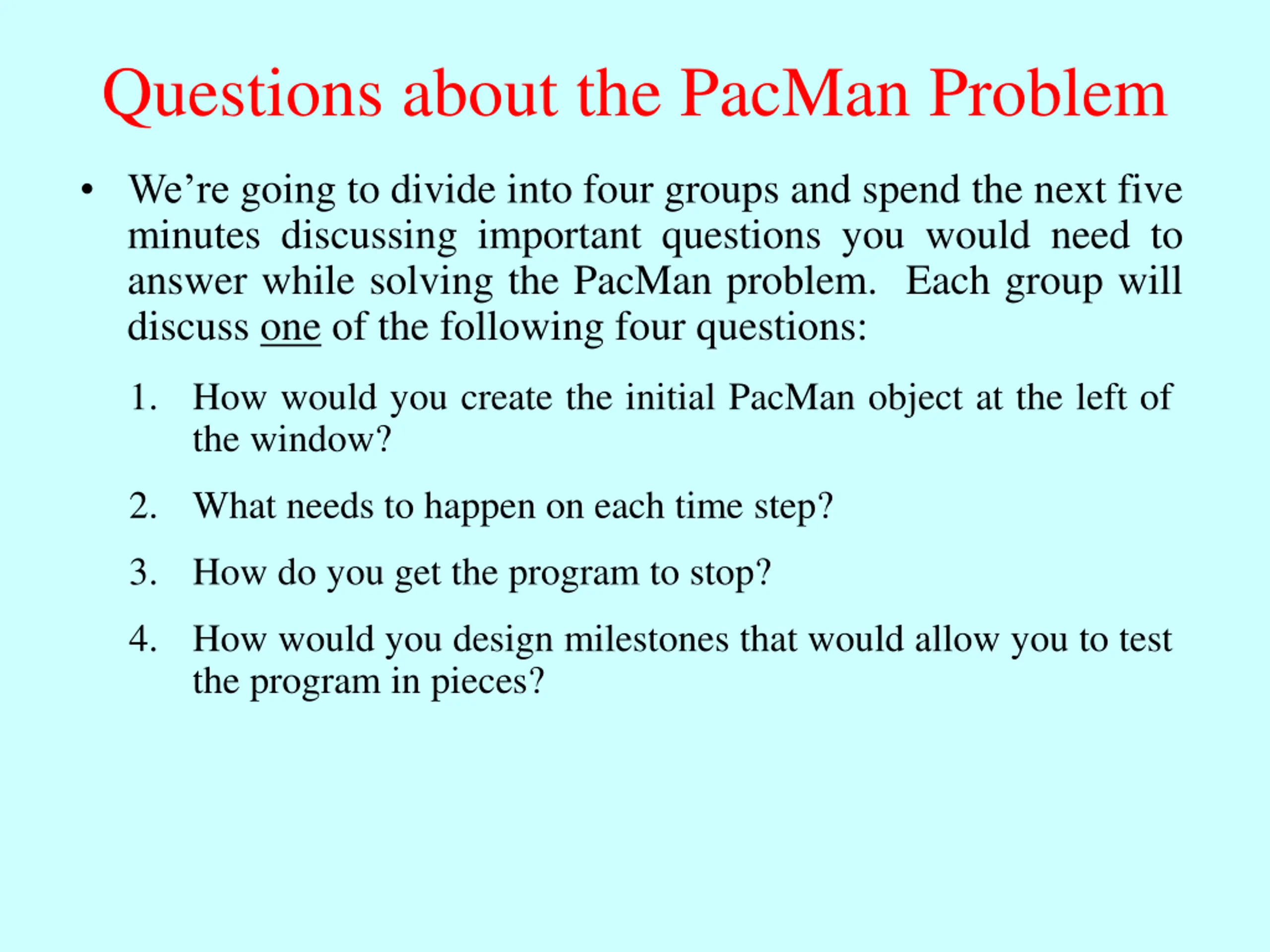 Questions about the PacMan Problem We re going to divide into four groups and spend the next five minutes discussing important questions you would need to answer while solving the PacMan problem. Each group will discuss one of the following four questions: 1. How would you create the initial PacMan object at the left of the window? 2. What needs to happen on each time step? 3. How do you get the program to stop? 4. How would you design milestones that would allow you to test the program in pieces?