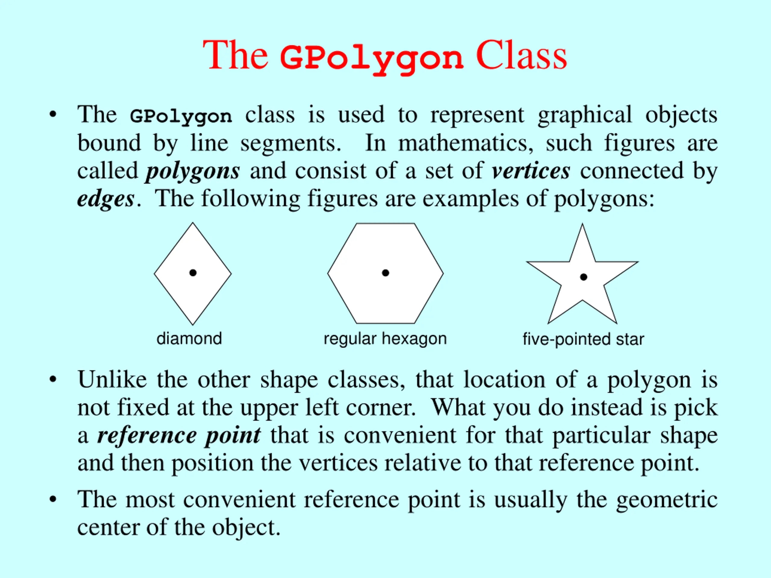 The GPolygon Class The GPolygon class is used to represent graphical objects bound by line segments. In mathematics, such figures are called polygons and consist of a set of vertices connected by edges. The following figures are examples of polygons: diamond regular hexagon five-pointed star Unlike the other shape classes, that location of a polygon is not fixed at the upper left corner. What you do instead is pick a reference point that is convenient for that particular shape and then position the vertices relative to that reference point. The most convenient reference point is usually the geometric center of the object.