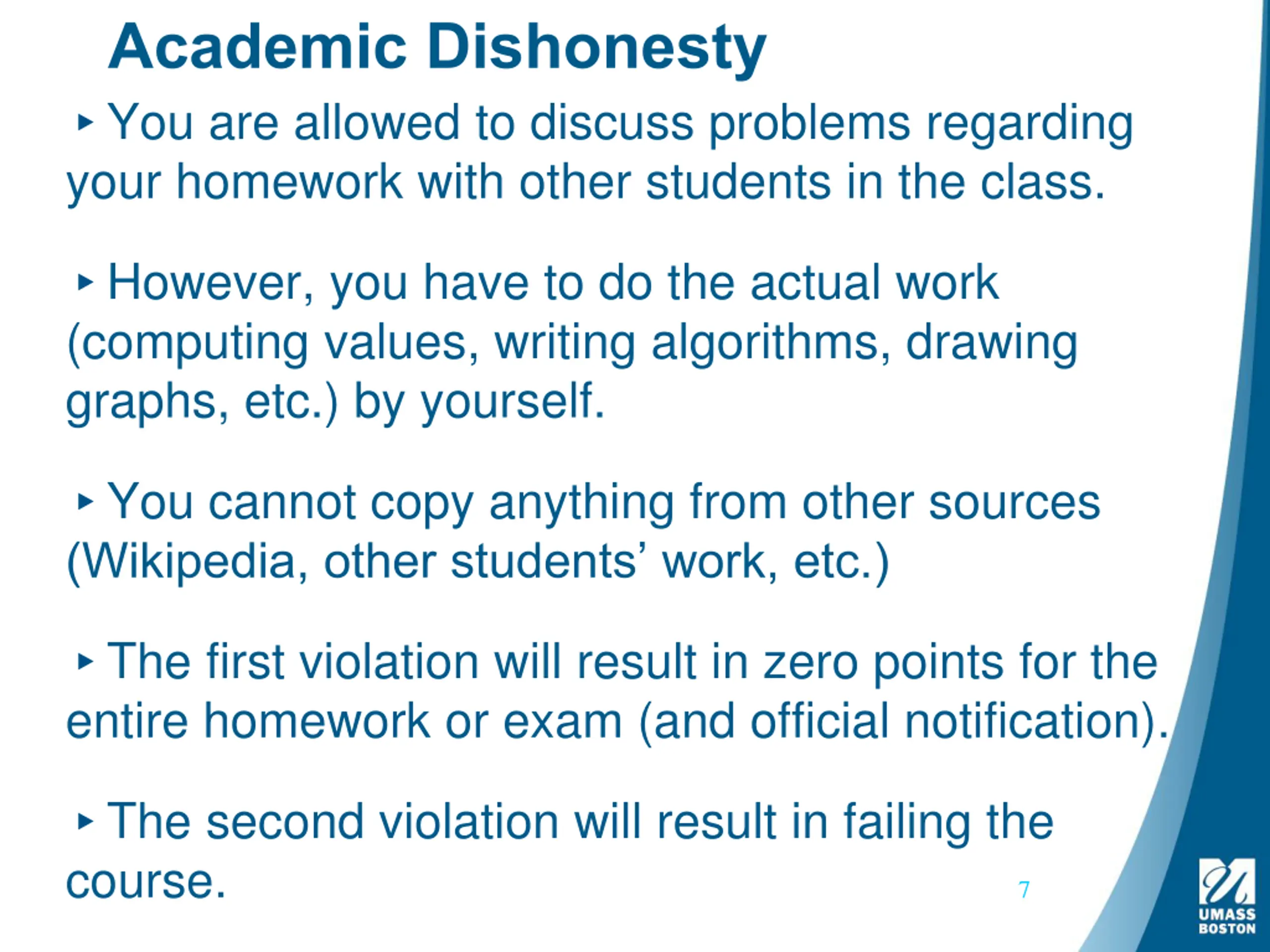 Academic Dishonesty You are allowed to discuss problems regarding your homework with other students in the class. However, you have to do the actual work (computing values, writing algorithms, drawing graphs, etc.) by yourself. You cannot copy anything from other sources (Wikipedia, other students work, etc.) The first violation will result in zero points for the entire homework or exam (and official notification). The second violation will result in failing the course. 7