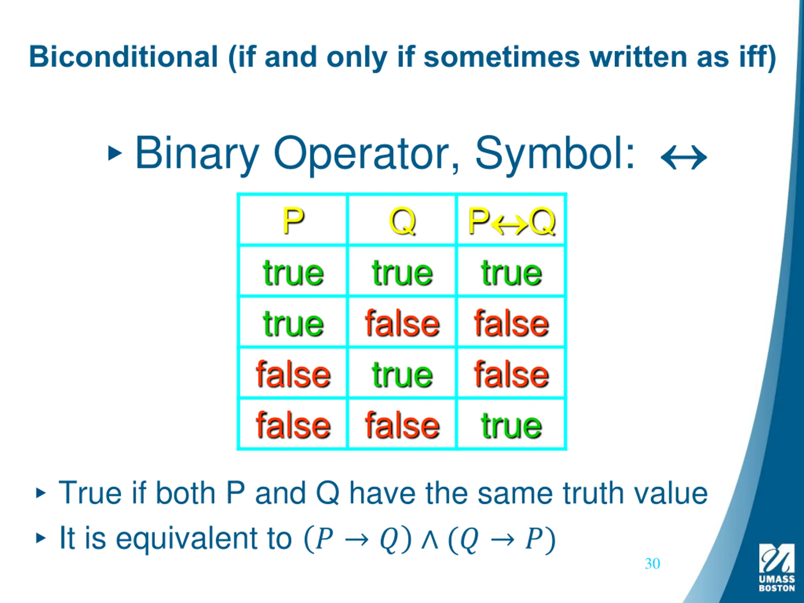 Biconditional (if and only if sometimes written as iff) Binary Operator, Symbol: P Q true false false true P Q true true false false true false true false True if both P and Q have the same truth value It is equivalent to ? ? (? ?) 30