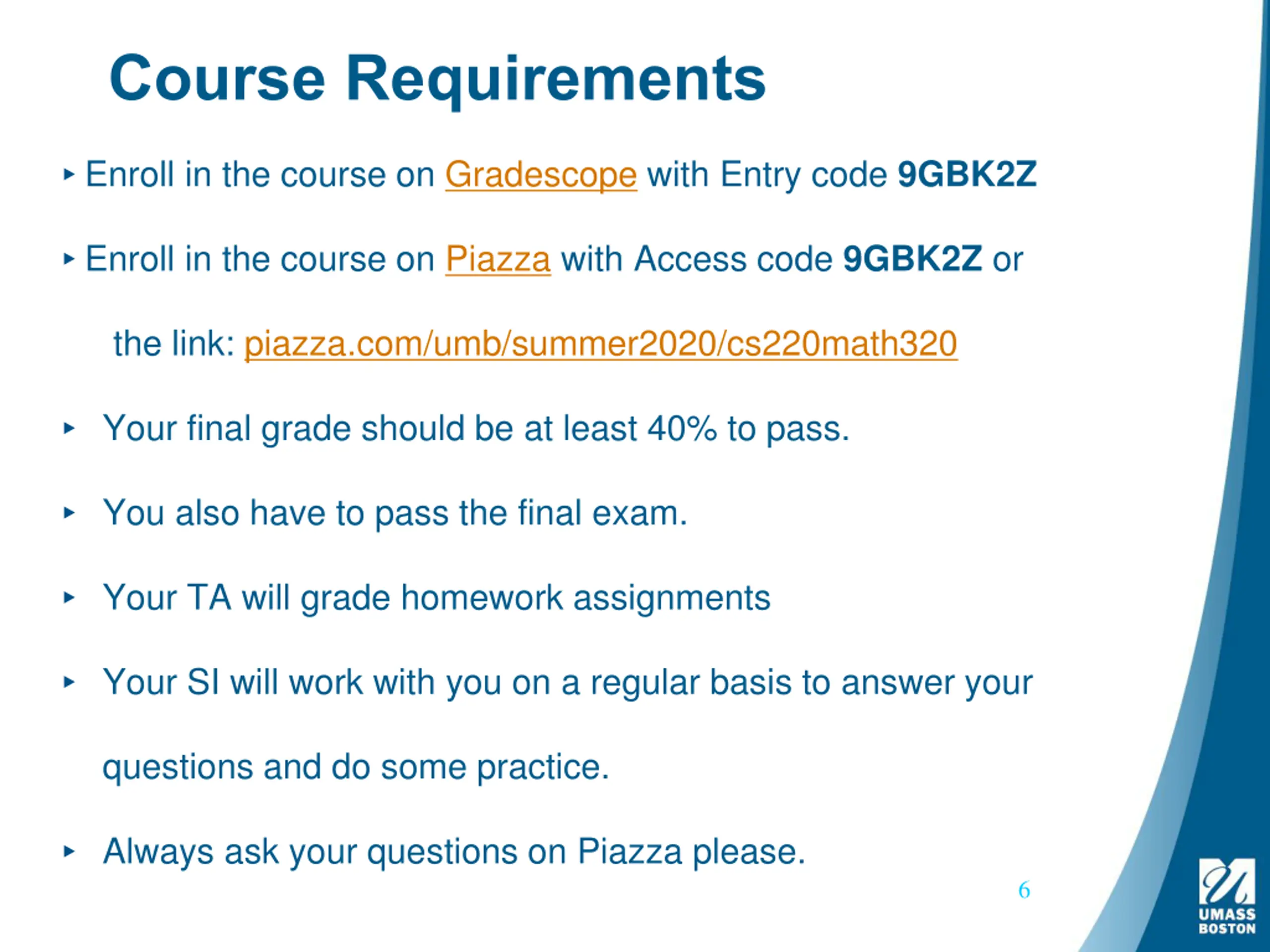 Course Requirements Enroll in the course on Gradescope with Entry code 9GBK2Z Enroll in the course on Piazza with Access code 9GBK2Z or the link: piazza.com/umb/summer2020/cs220math320 Your final grade should be at least 40% to pass. You also have to pass the final exam. Your TA will grade homework assignments Your SI will work with you on a regular basis to answer your questions and do some practice. Always ask your questions on Piazza please. 6