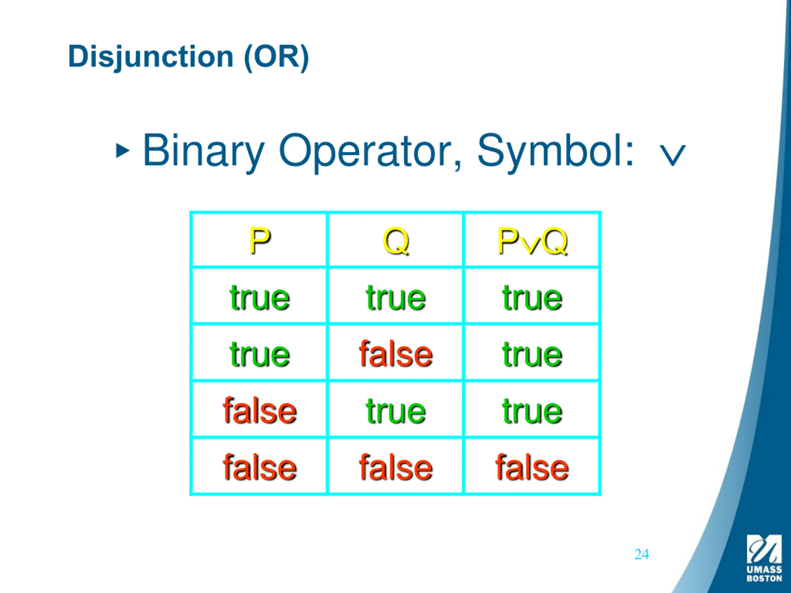 Disjunction (OR) Binary Operator, Symbol: P Q true true true false P Q true true false false true false true false 24