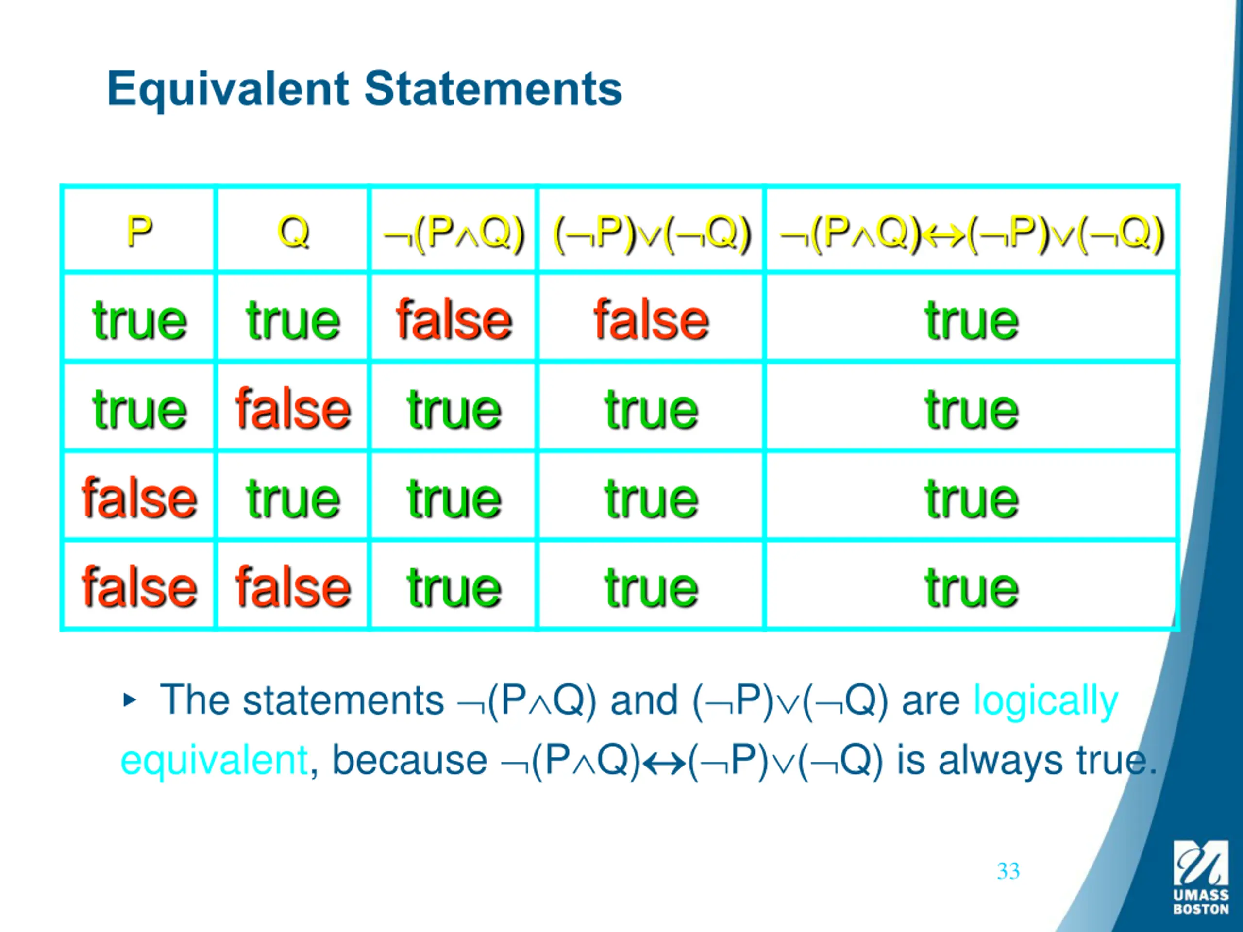Equivalent Statements (P Q) ( P) ( Q) (P Q) ( P) ( Q) P Q true true false false true false false true false true true true false true true true true true true true The statements (P Q) and ( P) ( Q) are logically equivalent, because (P Q) ( P) ( Q) is always true. 33