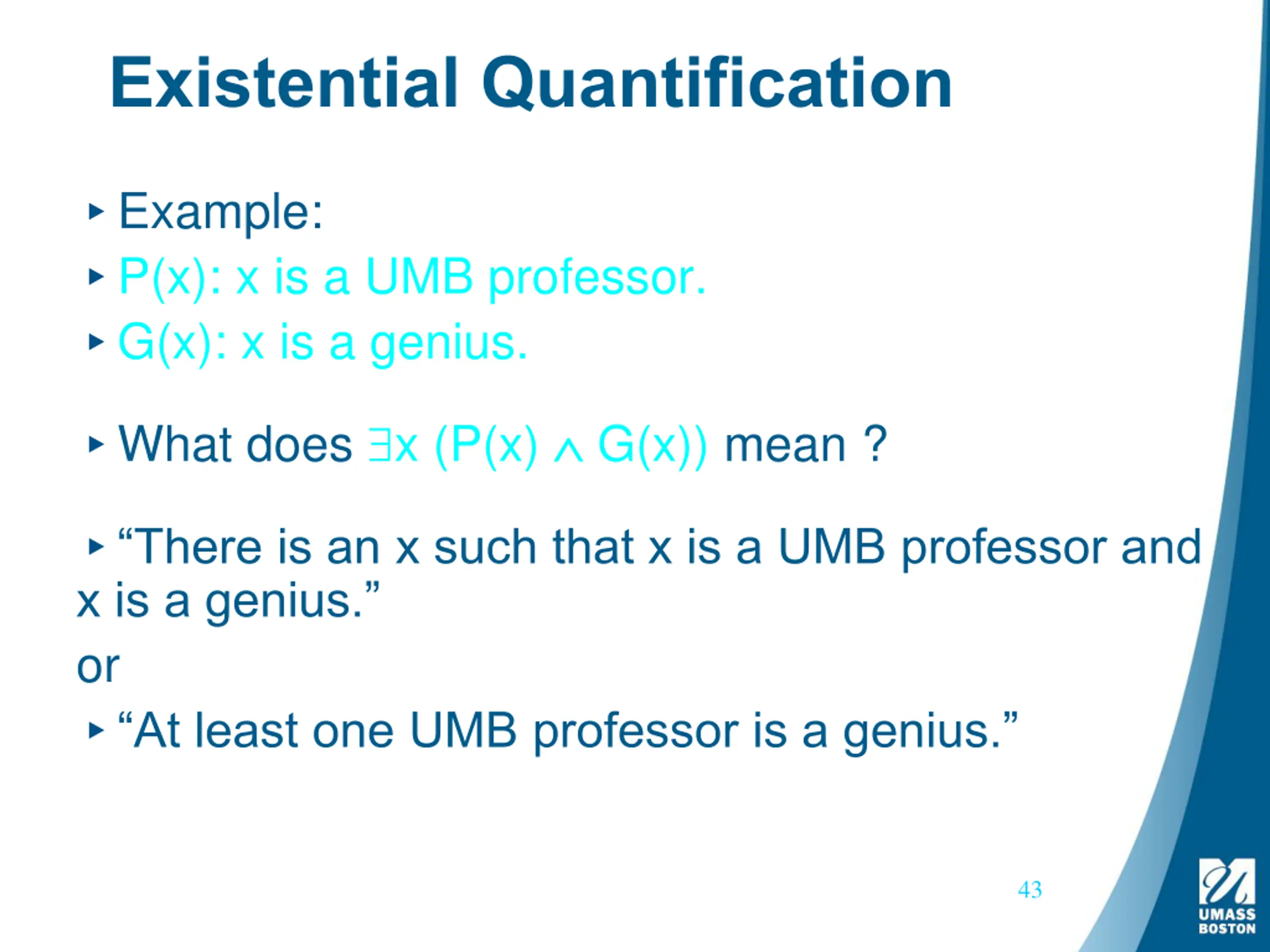 Existential Quantification Example: P(x): x is a UMB professor. G(x): x is a genius. What does x (P(x) G(x)) mean ? There is an x such that x is a UMB professor and x is a genius. or At least one UMB professor is a genius. 43