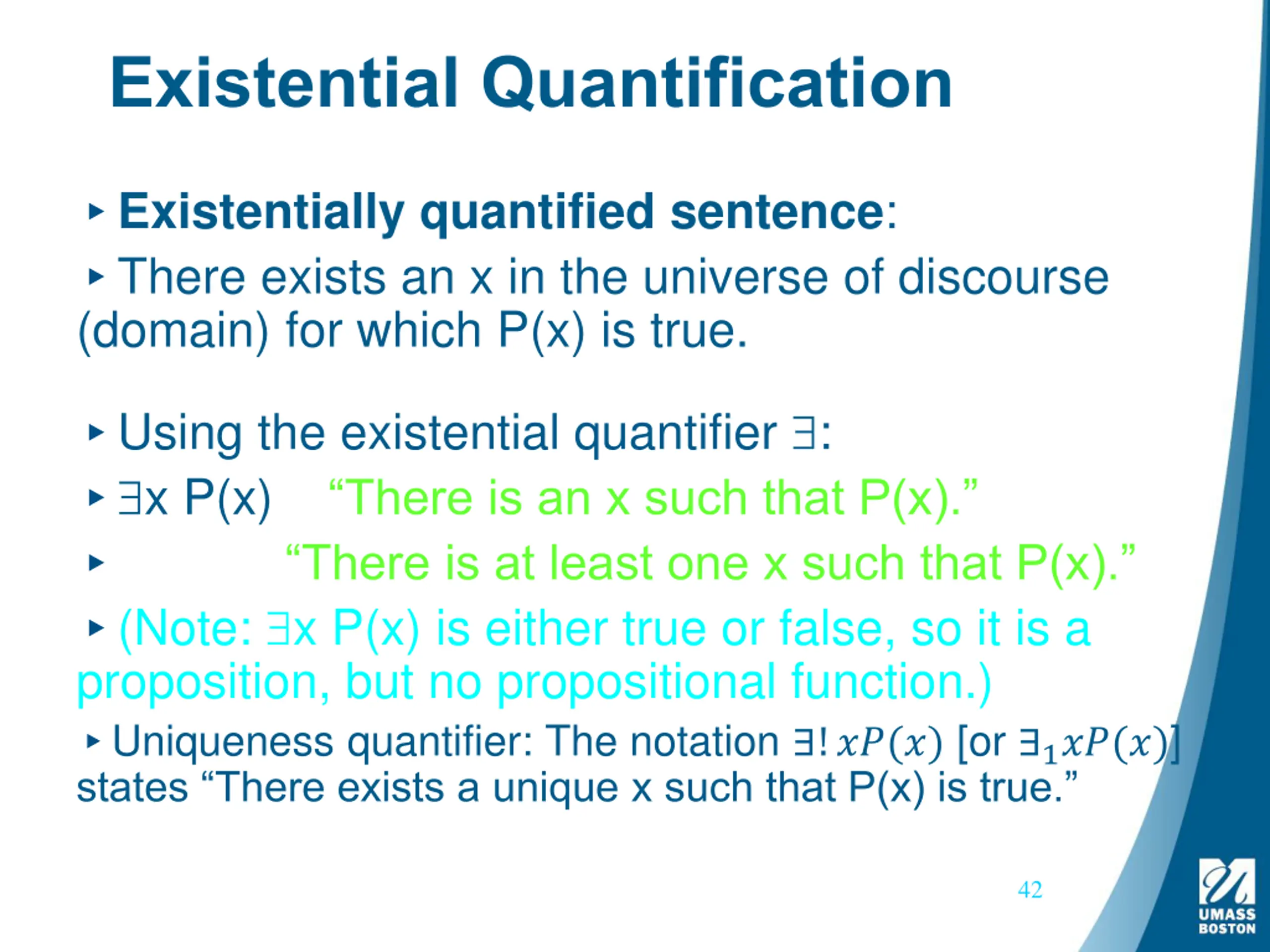 Existential Quantification Existentially quantified sentence: There exists an x in the universe of discourse (domain) for which P(x) is true. Using the existential quantifier : x P(x) There is an x such that P(x). There is at least one x such that P(x). (Note: x P(x) is either true or false, so it is a proposition, but no propositional function.) Uniqueness quantifier: The notation !??(?) [or 1??(?)] states There exists a unique xsuch that P(x) is true. 42