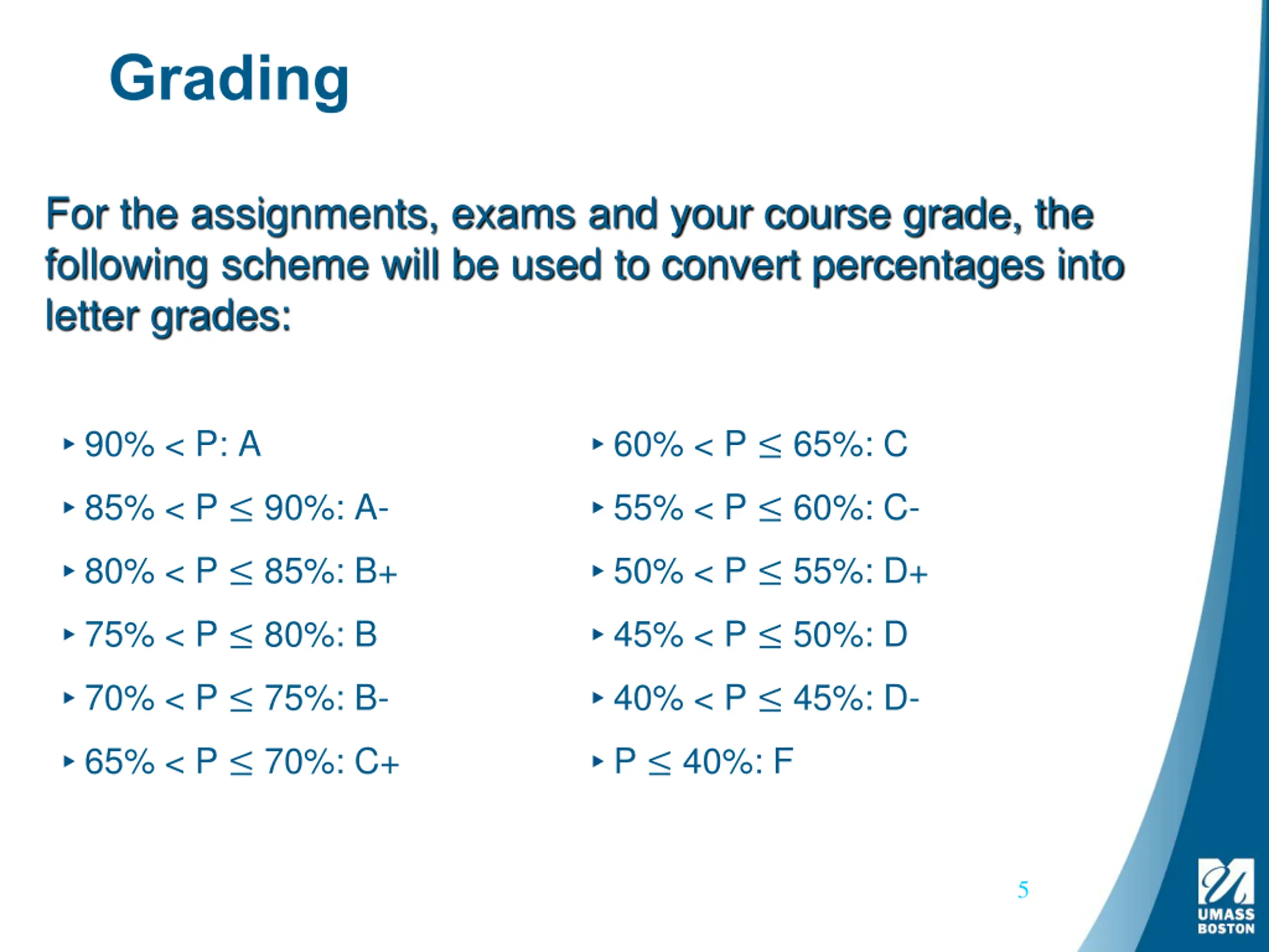 Grading For the assignments, exams and your course grade, the following scheme will be used to convert percentages into letter grades: 90% < P: A 60% < P 65%: C 85% < P 90%: A- 55% < P 60%: C- 80% < P 85%: B+ 50% < P 55%: D+ 75% < P 80%: B 45% < P 50%: D 70% < P 75%: B- 40% < P 45%: D- 65% < P 70%: C+ P 40%: F 5