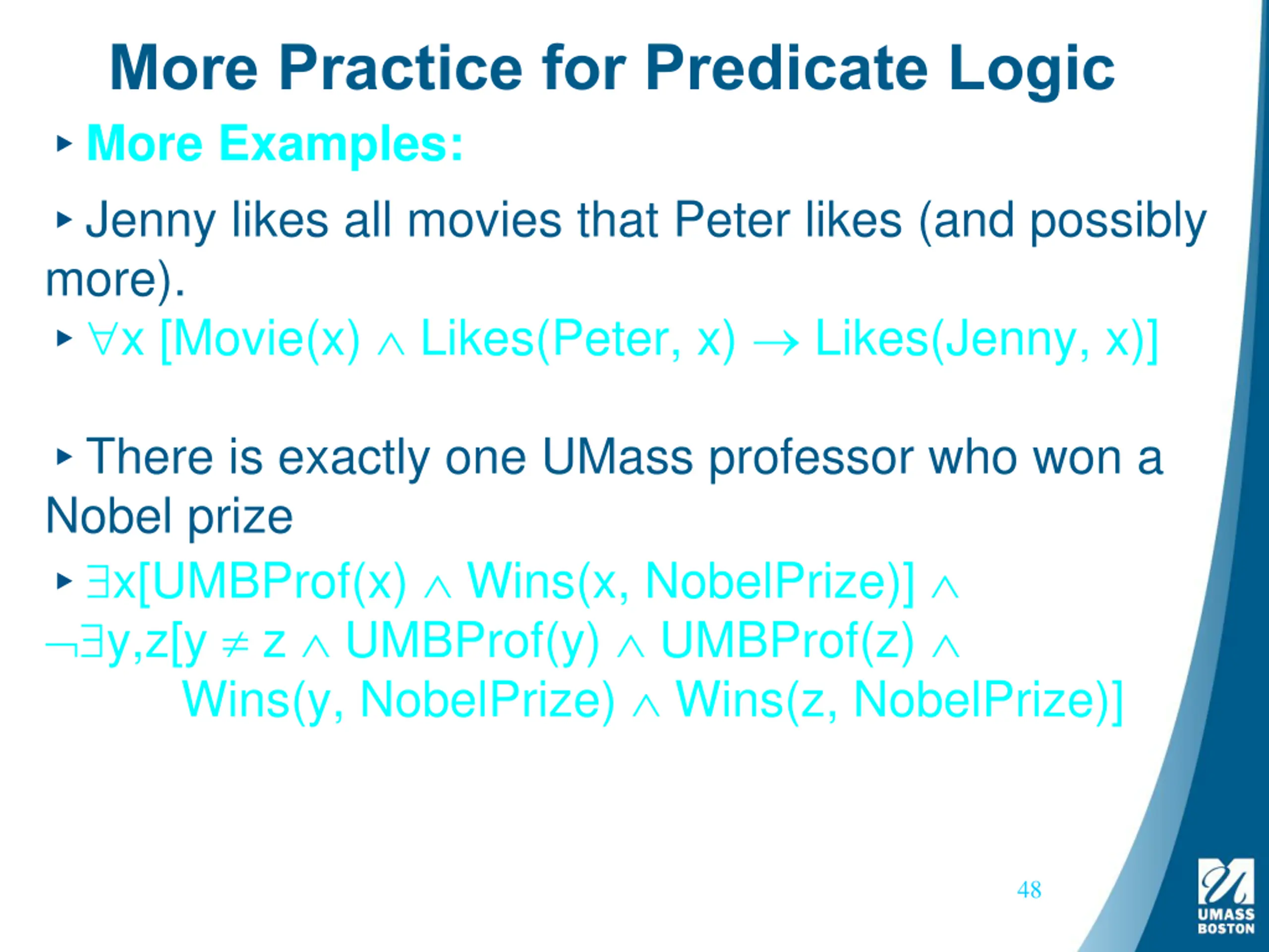More Practice for Predicate Logic More Examples: Jenny likes all movies that Peter likes (and possibly more). x [Movie(x) Likes(Peter, x) Likes(Jenny, x)] There is exactly one UMass professor who won a Nobel prize x[UMBProf(x) Wins(x, NobelPrize)] y,z[y z UMBProf(y) UMBProf(z) Wins(y, NobelPrize) Wins(z, NobelPrize)] 48