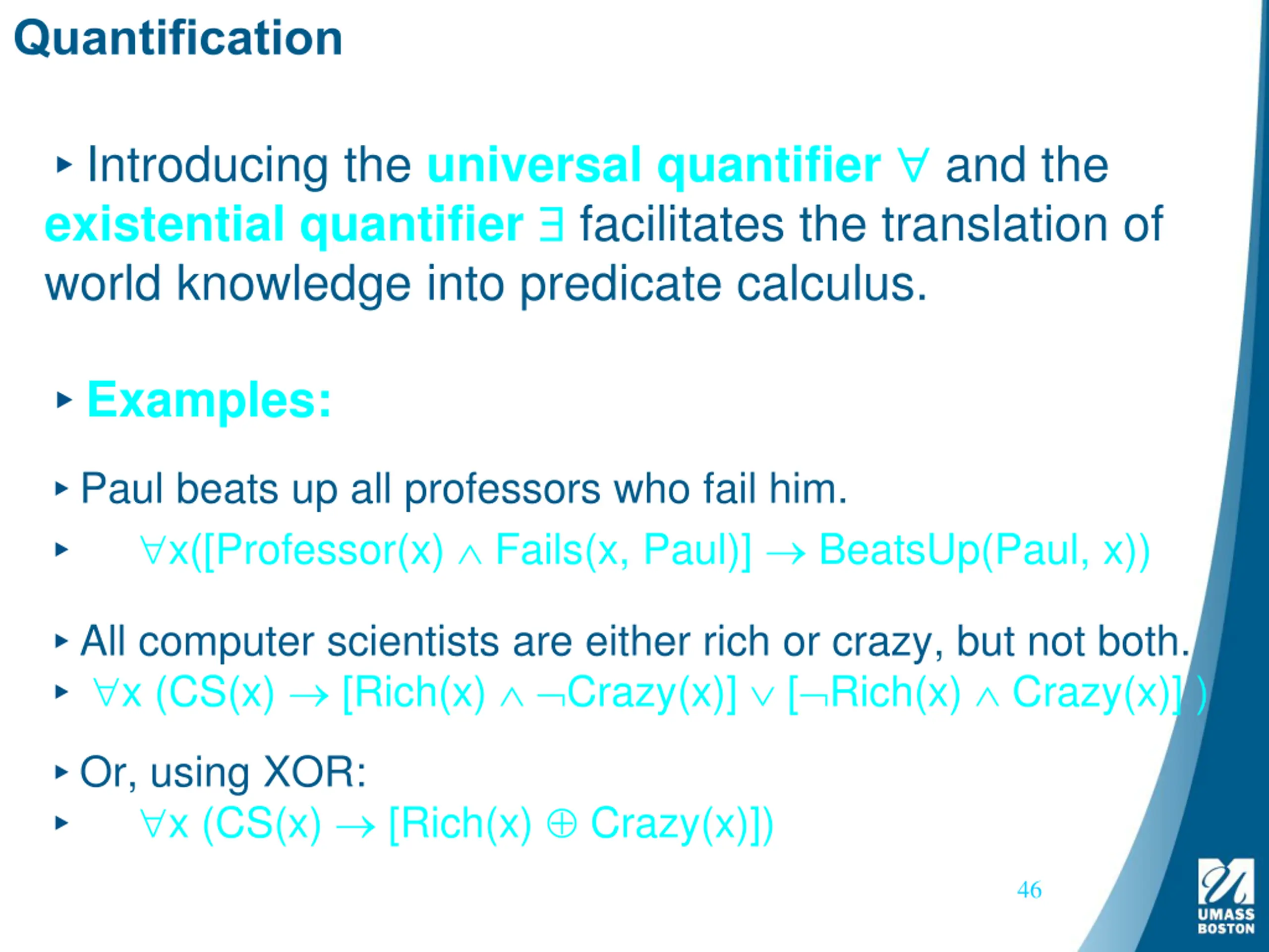Quantification Introducing the universal quantifier and the existential quantifier facilitates the translation of world knowledge into predicate calculus. Examples: Paul beats up all professors who fail him. x([Professor(x) Fails(x, Paul)] BeatsUp(Paul, x)) All computer scientists are either rich or crazy, but not both. x (CS(x) [Rich(x) Crazy(x)] [ Rich(x) Crazy(x)] ) Or, using XOR: x (CS(x) [Rich(x) Crazy(x)]) 46