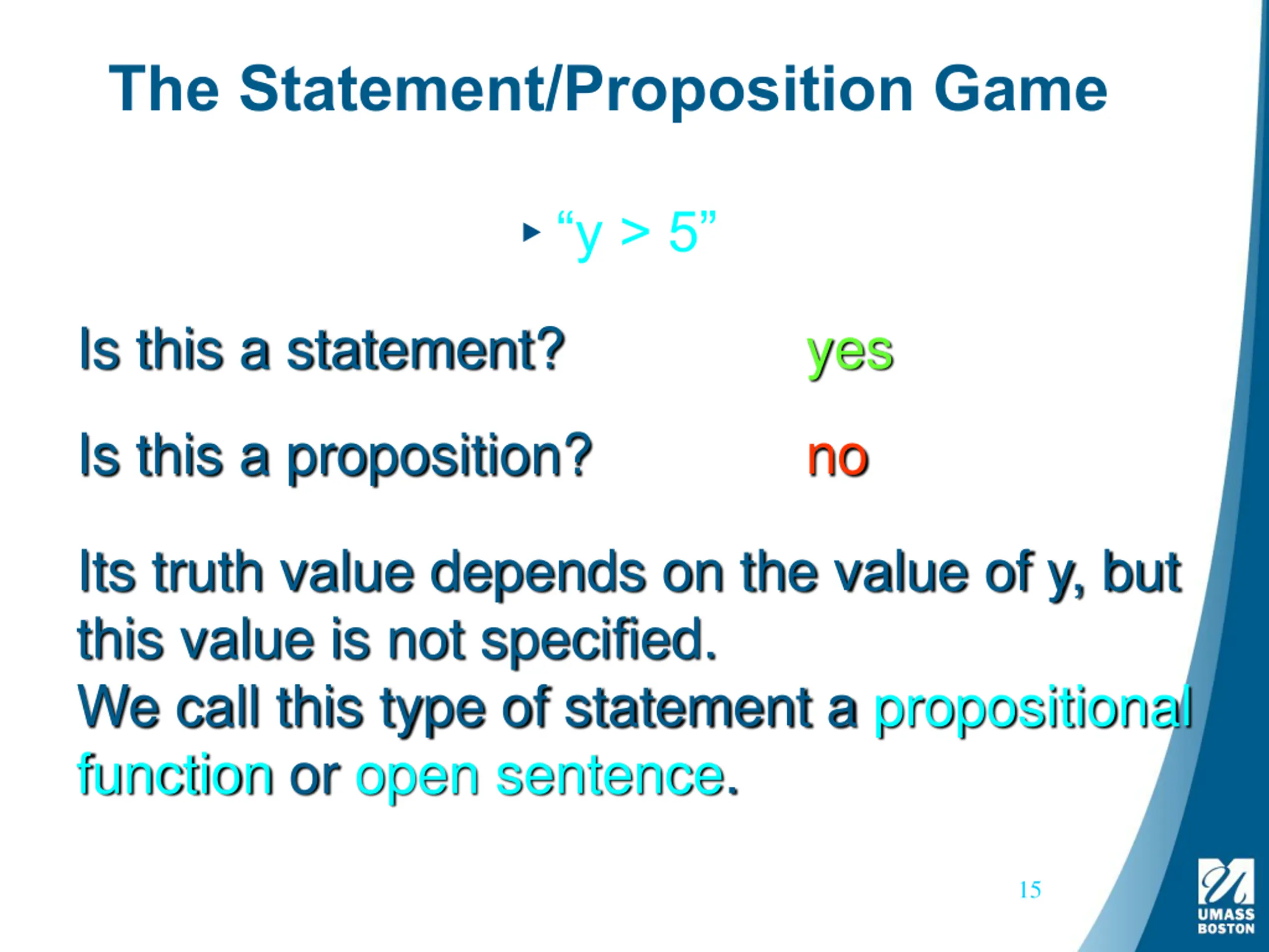 The Statement/Proposition Game y > 5 Is this a statement? yes Is this a proposition? no Its truth value depends on the value of y, but this value is not specified. We call this type of statement a propositional function or open sentence. 15