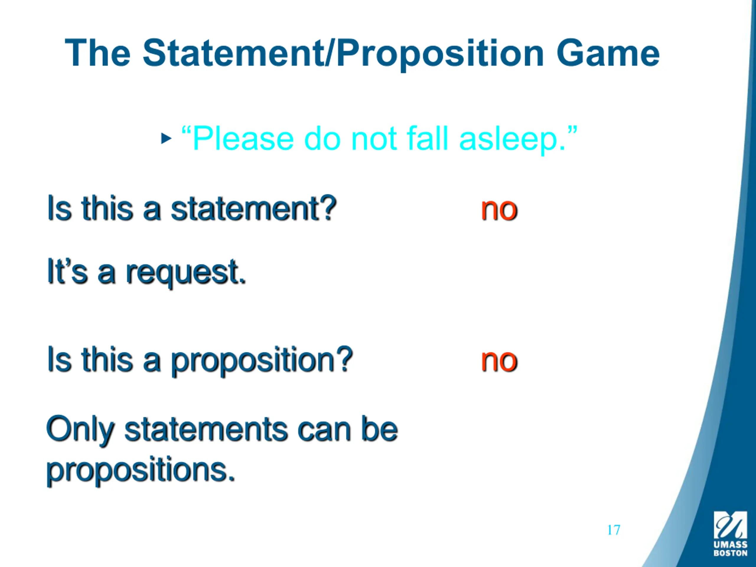 The Statement/Proposition Game Please do not fall asleep. Is this a statement? no It s a request. Is this a proposition? no Only statements can be propositions. 17