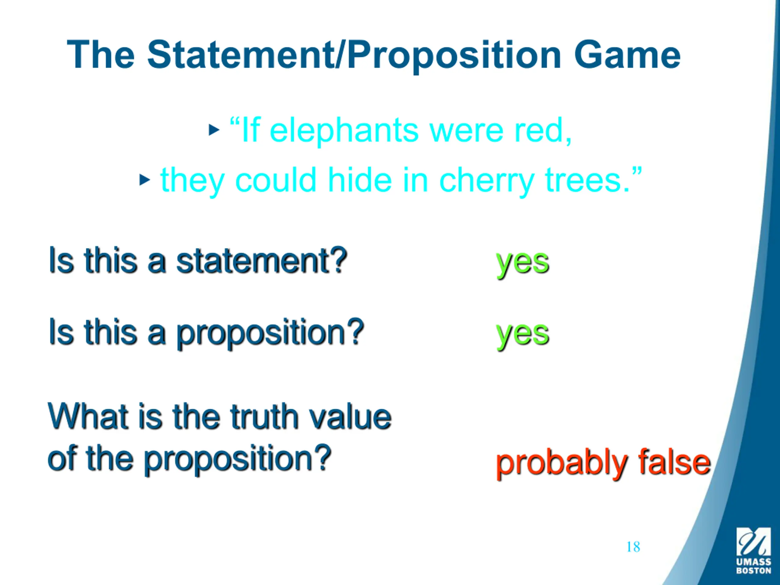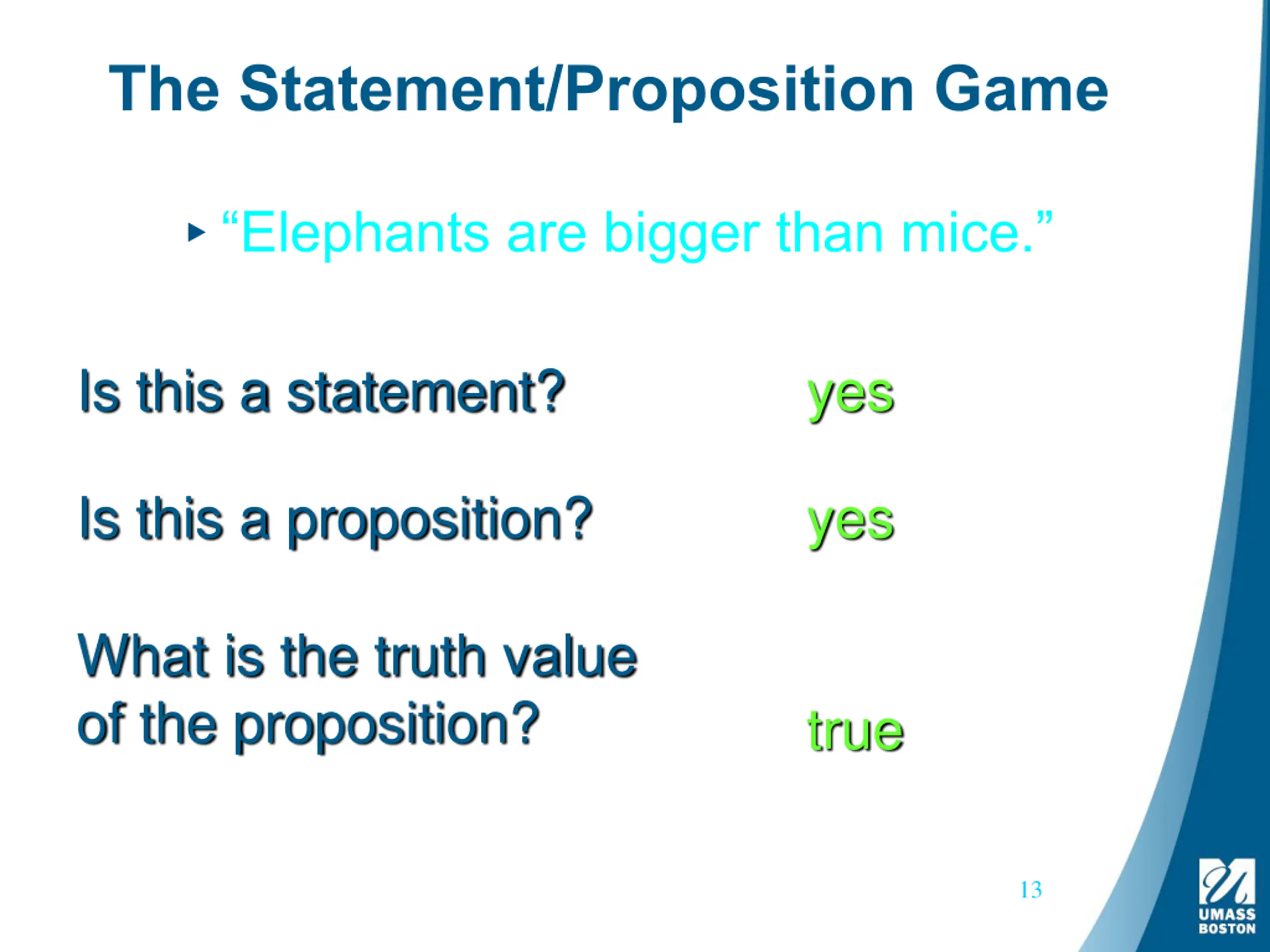 The Statement/Proposition Game Elephants are bigger than mice. Is this a statement? yes Is this a proposition? yes What is the truth value of the proposition? true 13