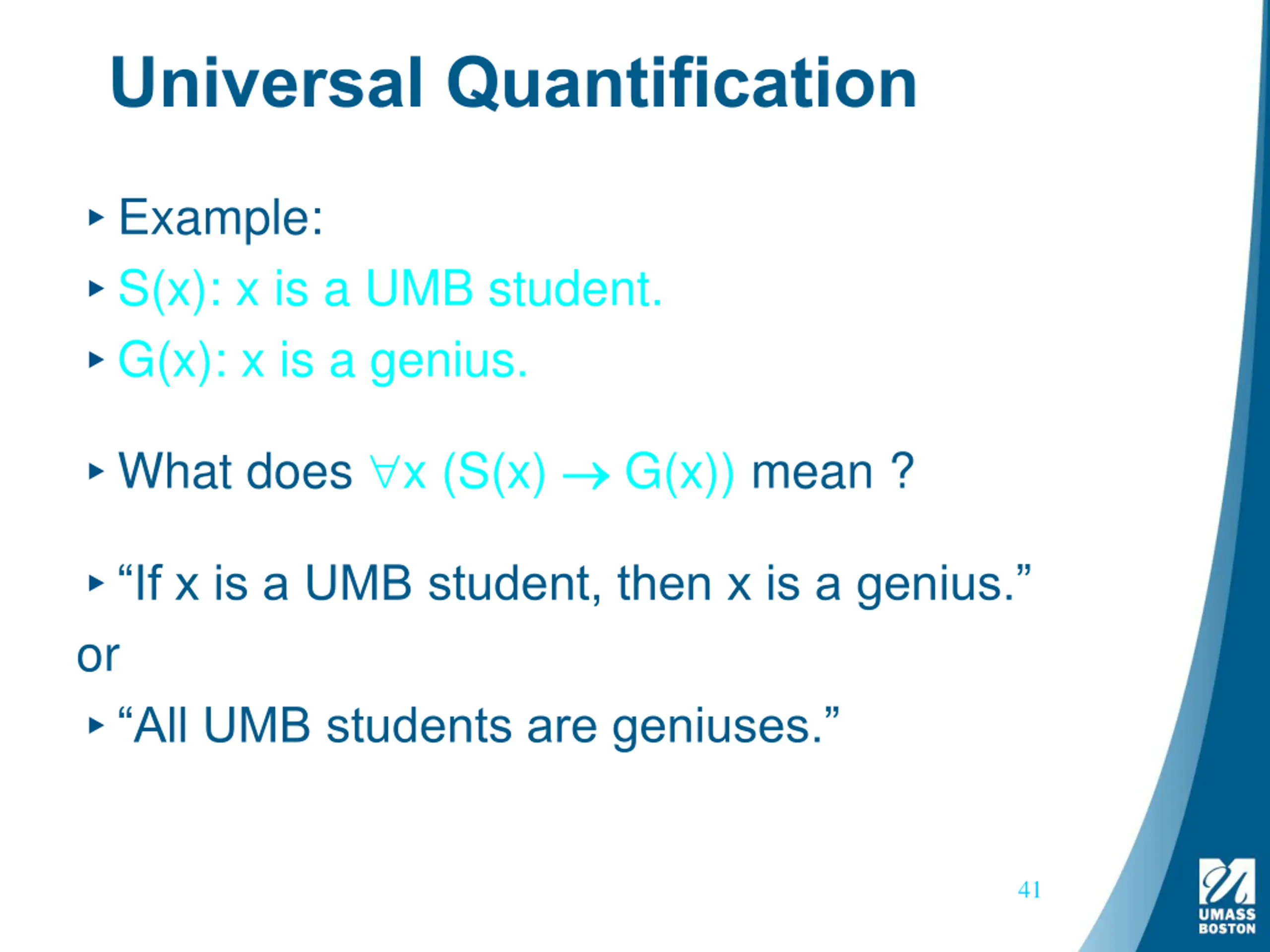 Universal Quantification Example: S(x): x is a UMB student. G(x): x is a genius. What does x (S(x) G(x)) mean ? If x is a UMB student, then x is a genius. or All UMB students are geniuses. 41