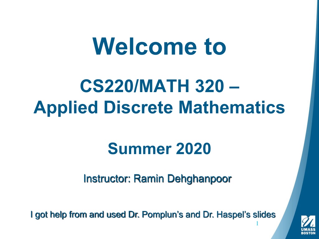 Welcome to CS220/MATH 320 Applied Discrete Mathematics Summer 2020 Instructor: Ramin Dehghanpoor I got help from and used Dr. Pomplun s and Dr. Haspel s slides 1