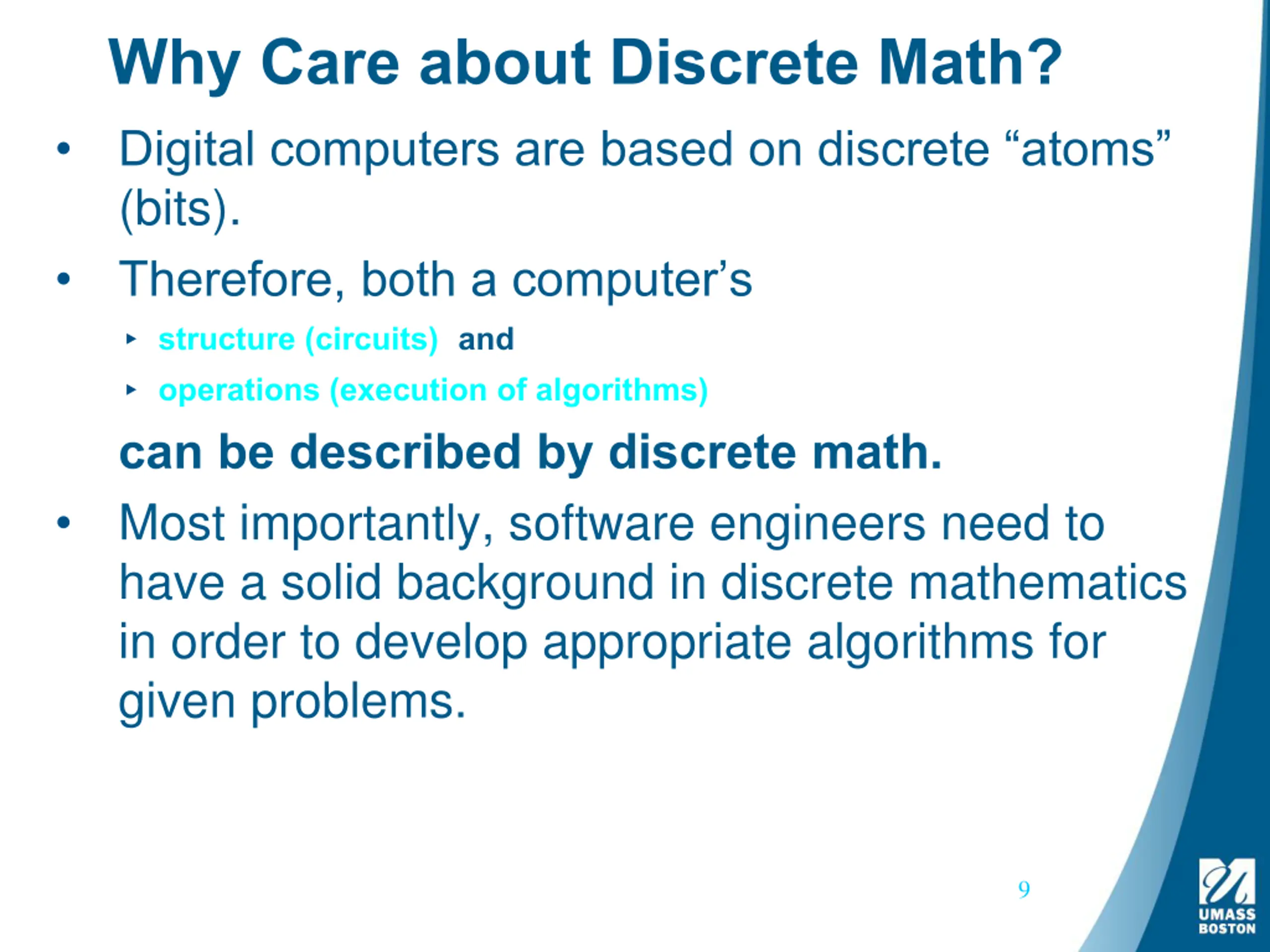 Why Care about Discrete Math? Digital computers are based on discrete atoms (bits). Therefore, both a computer s structure (circuits)and operations (execution of algorithms) can be described by discrete math. Most importantly, software engineers need to have a solid background in discrete mathematics in order to develop appropriate algorithms for given problems. 9