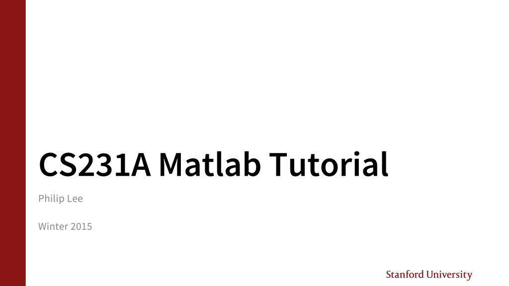 This tutorial provides an introduction to Matlab, including basic image manipulations, tips, and tricks. It covers the goals, what Matlab is good for, how to obtain Matlab through Stanford, small Matlab code snippets, publishing scripts, matrix and vector definitions, sequences, and matrix manipulations, with examples of vector indexing. The tutorial emphasizes practical usage and efficiency in scientific computations.