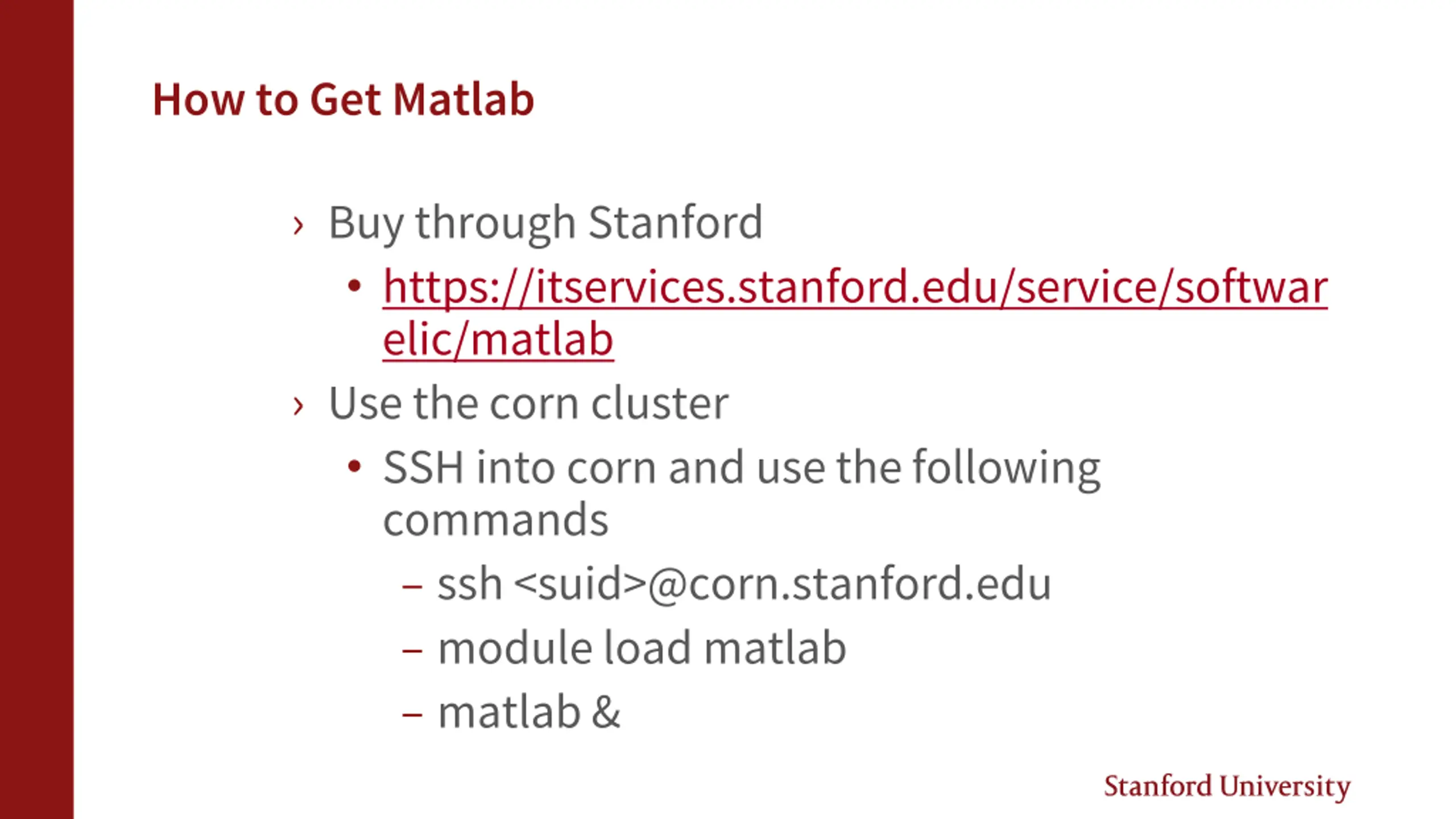 How to Get Matlab Buy through Stanford https://itservices.stanford.edu/service/softwar elic/matlab Use the corn cluster SSH into corn and use the following commands ssh<suid>@corn.stanford.edu module load matlab matlab&