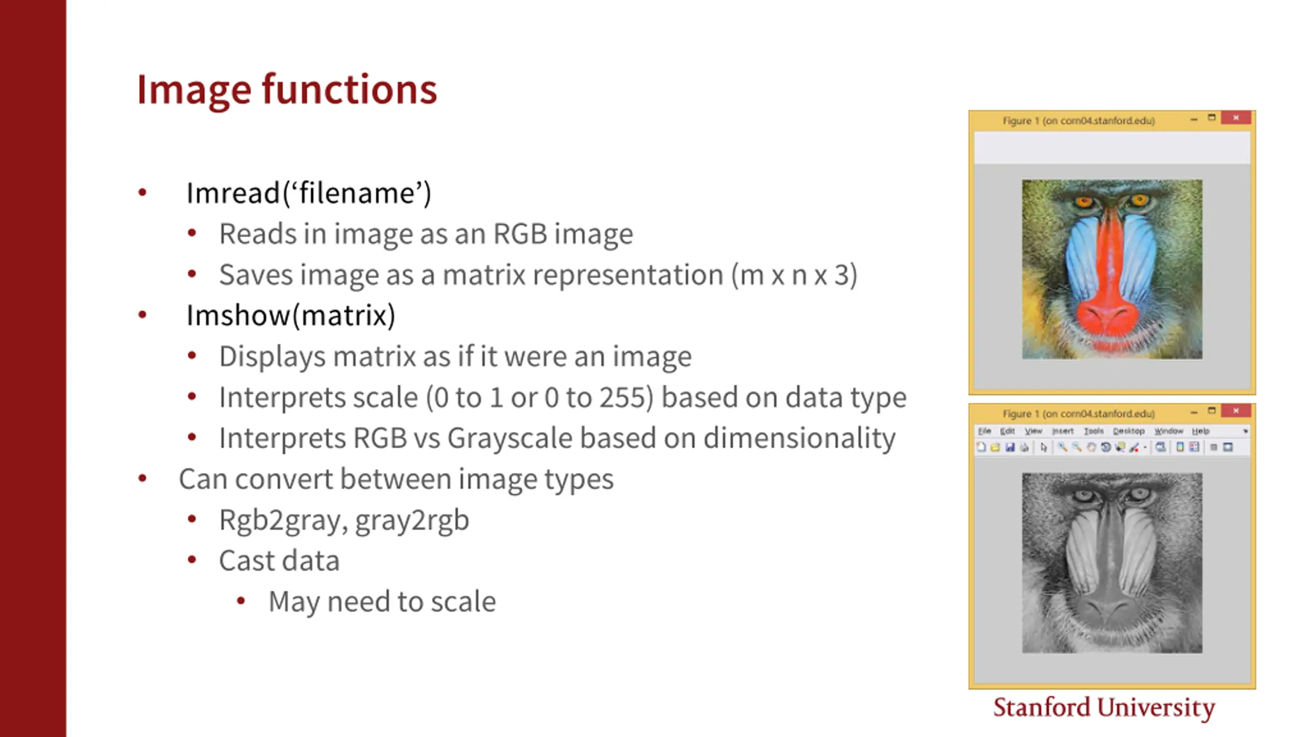 Image functions Imread( filename ) Reads in image as an RGB image Saves image as a matrix representation (m x n x 3) Imshow(matrix) Displays matrix as if it were an image Interprets scale (0 to 1 or 0 to 255) based on data type Interprets RGB vs Grayscale based on dimensionality Can convert between image types Rgb2gray, gray2rgb Cast data May need to scale
