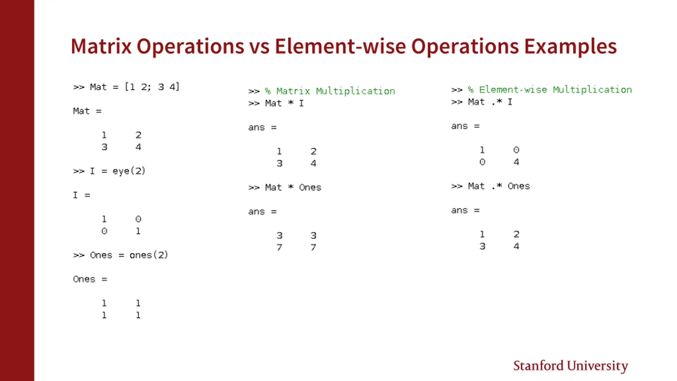 Matrix Operations vsElement-wise Operations Default operators are Matrix operations + - * / ^ There are analogous element-wise operators + - .* ./ .^ Matrix-Matrix OR Matrix- vector operations Scalar-Scalar operations