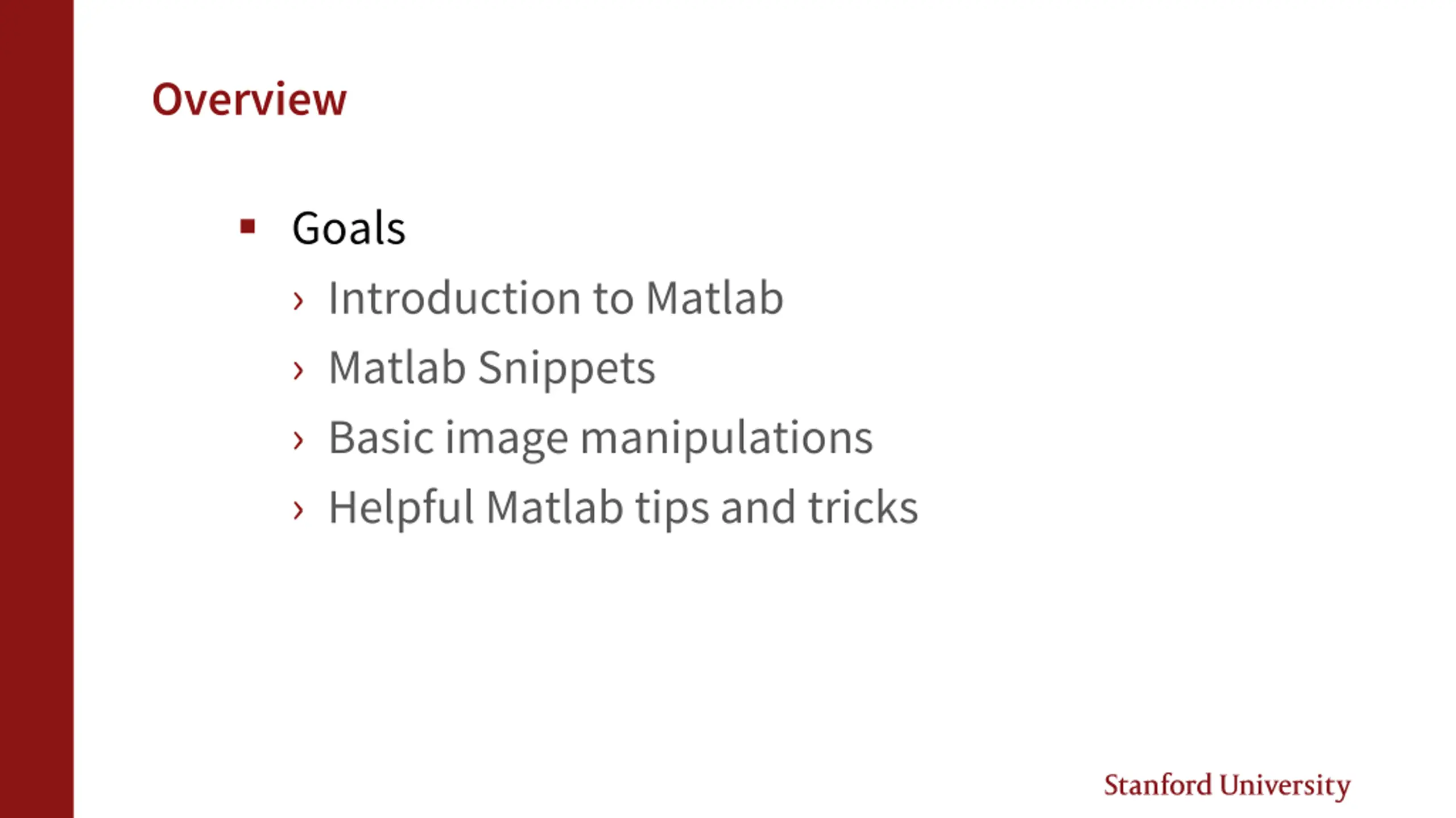 Overview Goals Introduction to Matlab Matlab Snippets Basic image manipulations Helpful Matlab tips and tricks