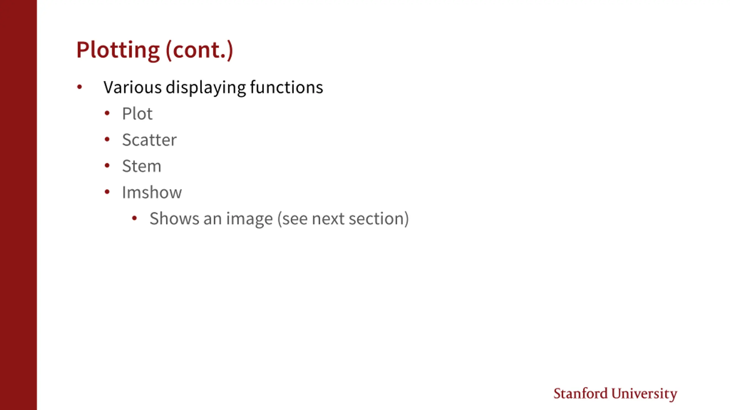 Plotting (cont.) Various displaying functions Plot Scatter Stem Imshow Shows an image (see next section)