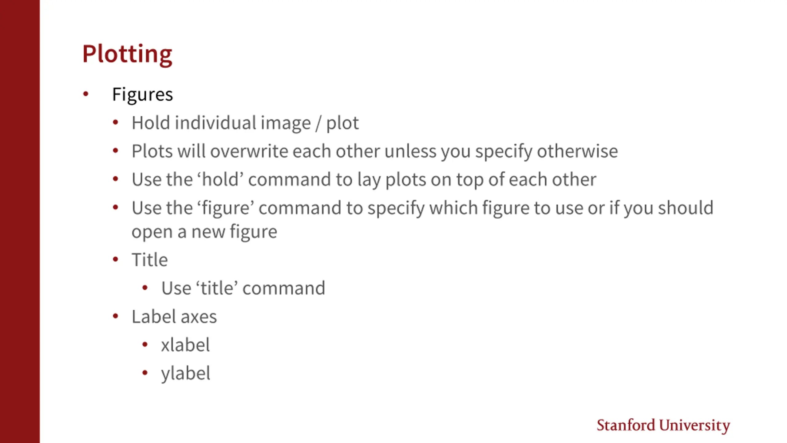 Plotting Figures Hold individual image / plot Plots will overwrite each other unless you specify otherwise Use the hold command to lay plots on top of each other Use the figure command to specify which figure to use or if you should open a new figure Title Use title command Label axes xlabel ylabel