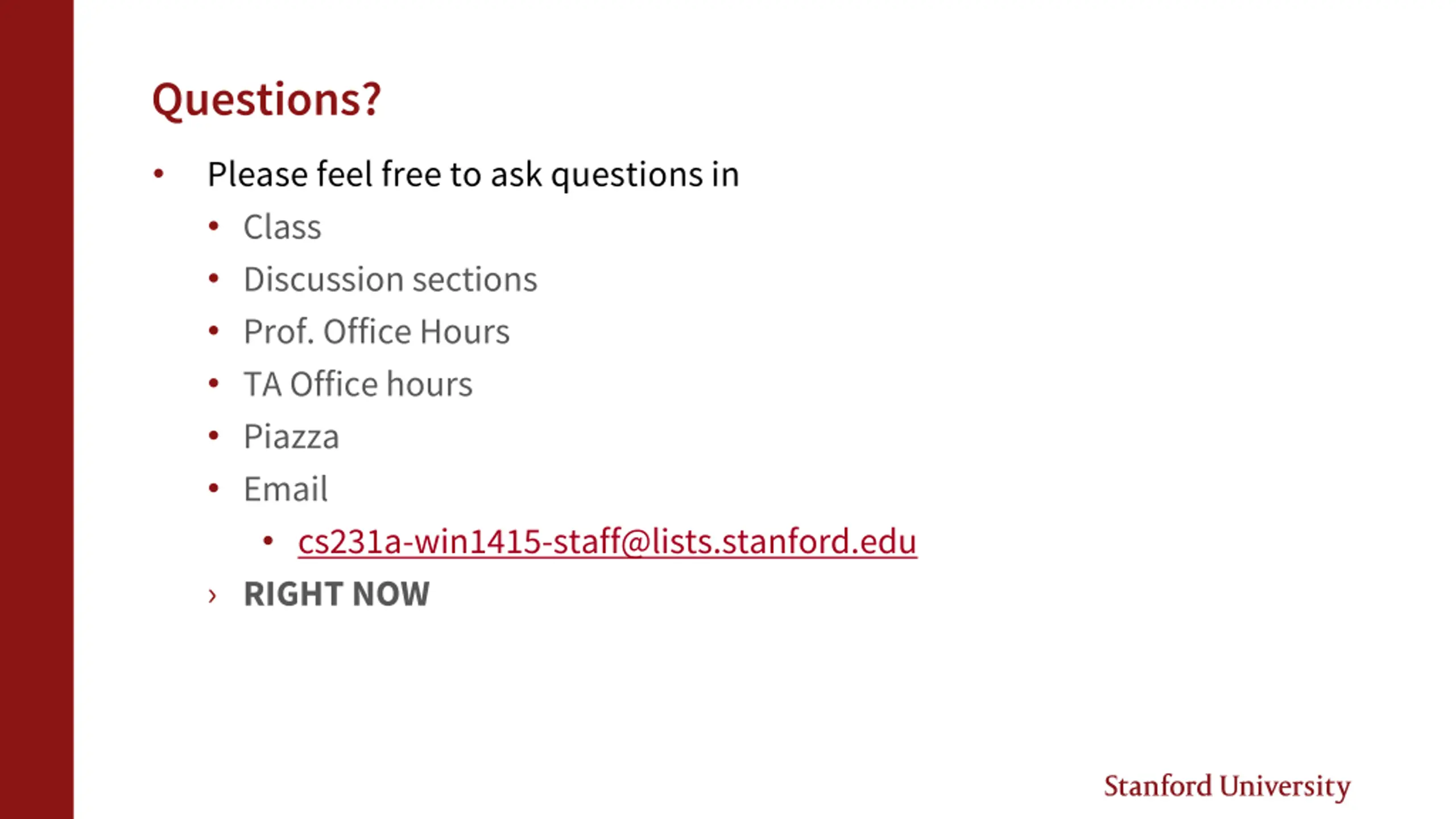 Questions? Please feel free to ask questions in Class Discussion sections Prof. Office Hours TA Office hours Piazza Email cs231a-win1415-staff@lists.stanford.edu RIGHT NOW