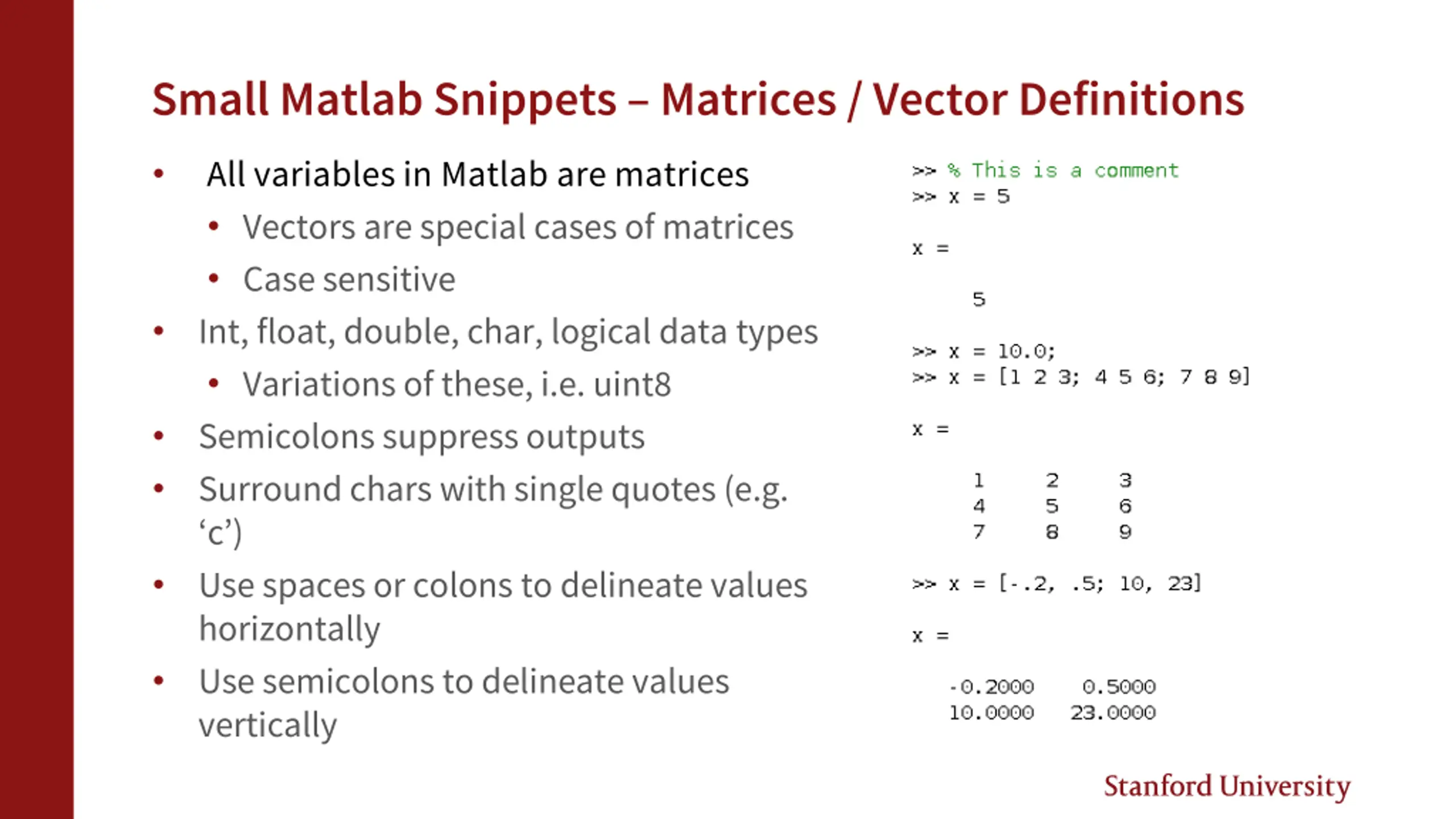 Small Matlab Snippets Matrices / Vector Definitions All variables in Matlab are matrices Vectors are special cases of matrices Case sensitive Int, float, double, char, logical data types Variations of these, i.e. uint8 Semicolons suppress outputs Surround chars with single quotes (e.g. c ) Use spaces or colons to delineate values horizontally Use semicolons to delineate values vertically