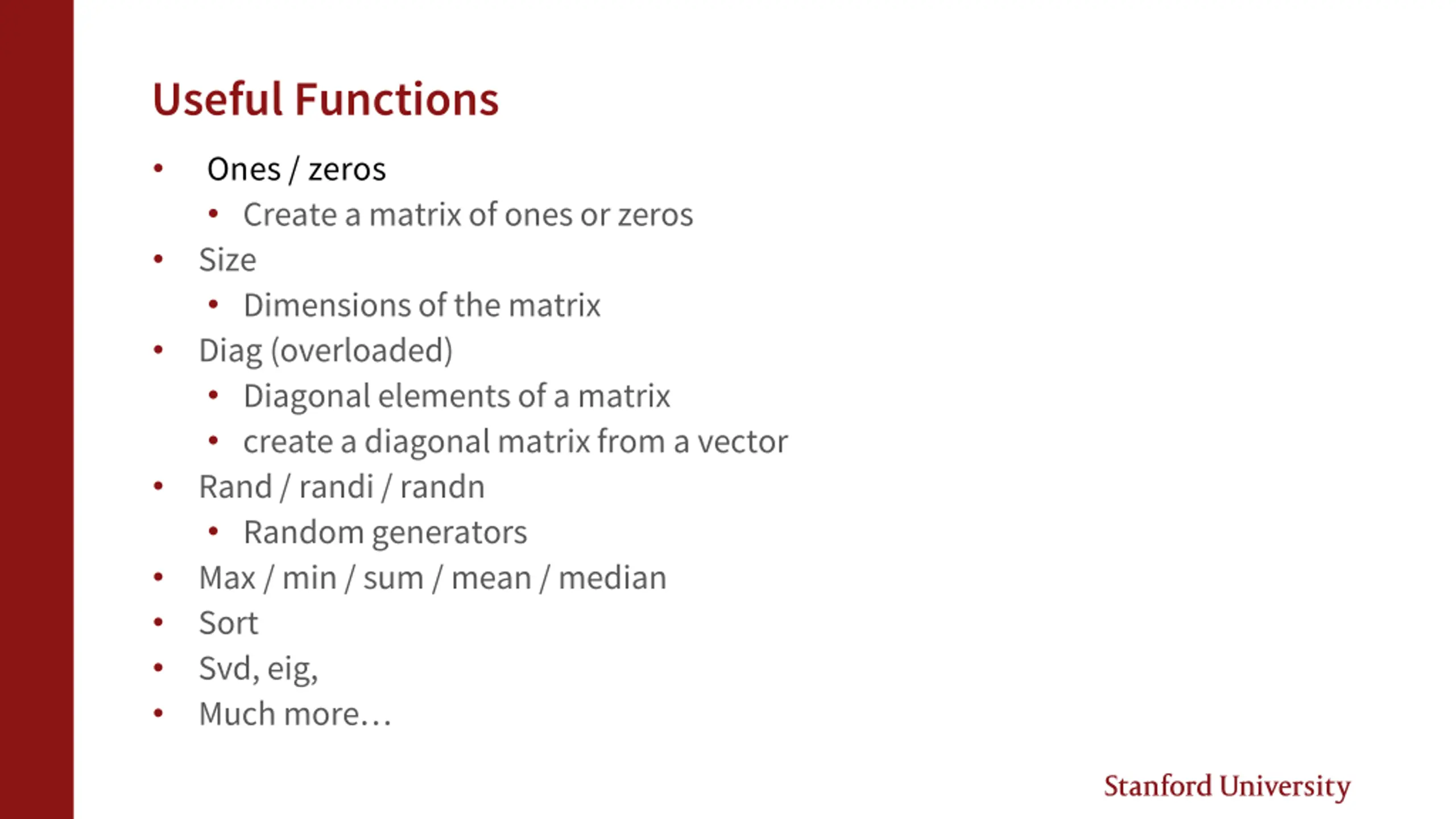 Useful Functions Ones / zeros Create a matrix of ones or zeros Size Dimensions of the matrix Diag (overloaded) Diagonal elements of a matrix create a diagonal matrix from a vector Rand / randi / randn Random generators Max / min / sum / mean / median Sort Svd, eig, Much more