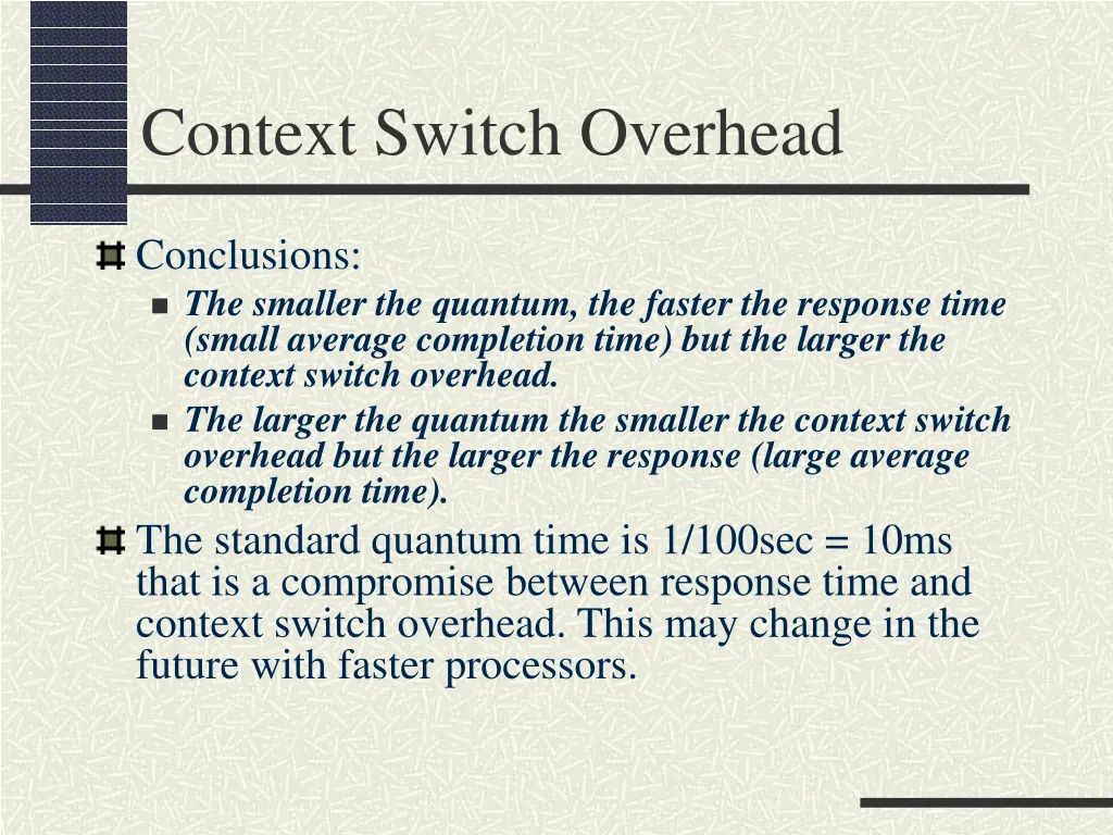 Context Switch Overhead Conclusions: The smaller the quantum, the faster the response time (small average completion time) but the larger the context switch overhead. The larger the quantum the smaller the context switch overhead but the larger the response (large average completion time). The standard quantum time is 1/100sec = 10ms that is a compromise between response time and context switch overhead. This may change in the future with faster processors.