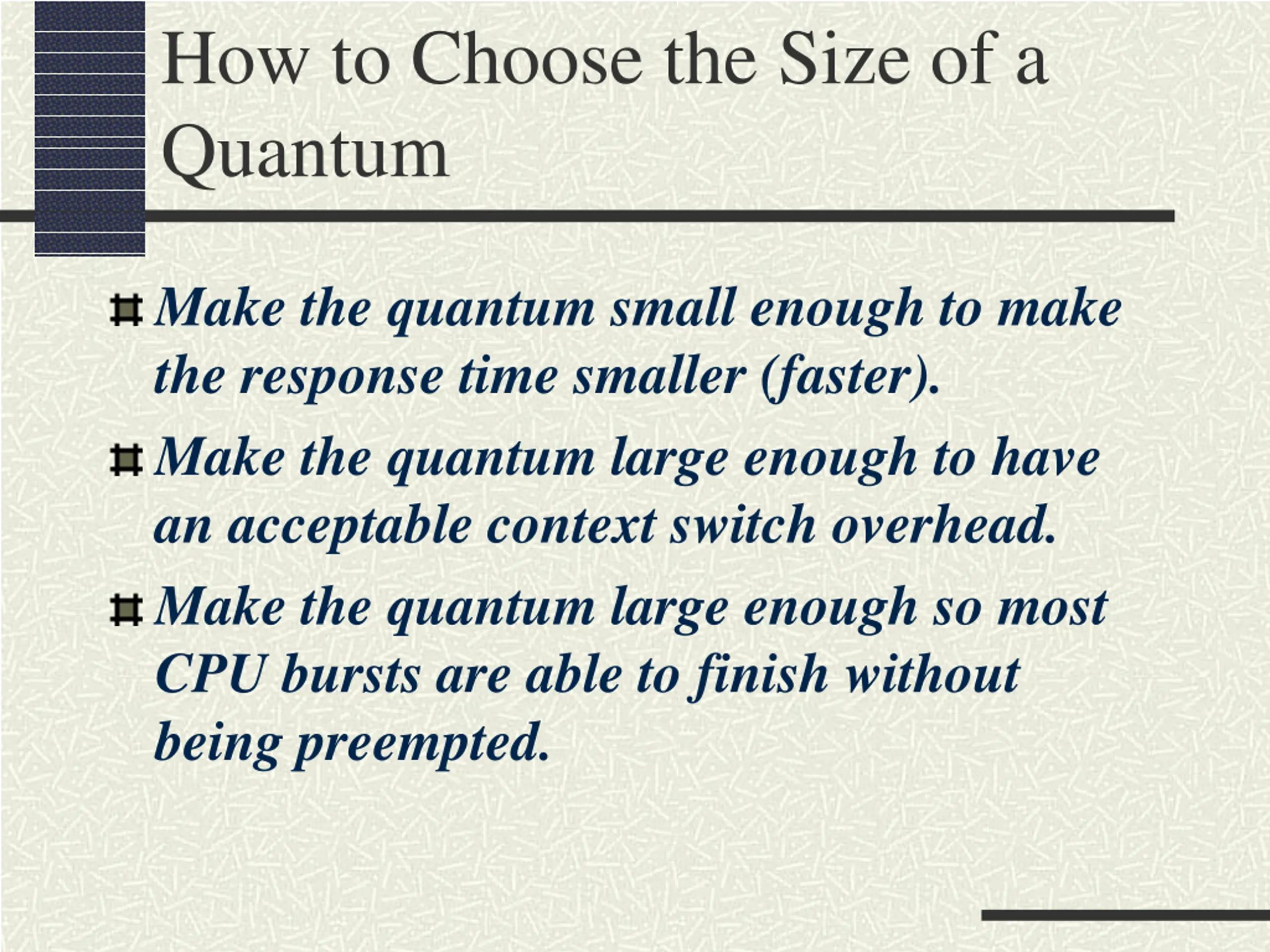 How to Choose the Size of a Quantum Make the quantum small enough to make the response time smaller (faster). Make the quantum large enough to have an acceptable context switch overhead. Make the quantum large enough so most CPU bursts are able to finish without being preempted.