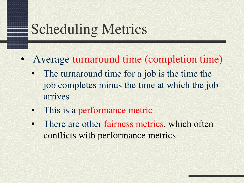 Scheduling Metrics Average turnaround time (completion time) The turnaround time for a job is the time the job completes minus the time at which the job arrives This is a performance metric There are other fairness metrics, which often conflicts with performance metrics